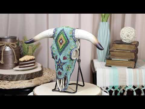 • Looking just like its real life counterpart, this faux steer cow skull features intricate tooled jointed beaded Aztec vector patterns in turquoise, red, yellow and many more colors. This Native Tribal Cow Skull is great as a gift to any taxidermy collector, or a great compliment to an avid hunter/huntress. Goes perfectly with any southwestern or western decor themes.