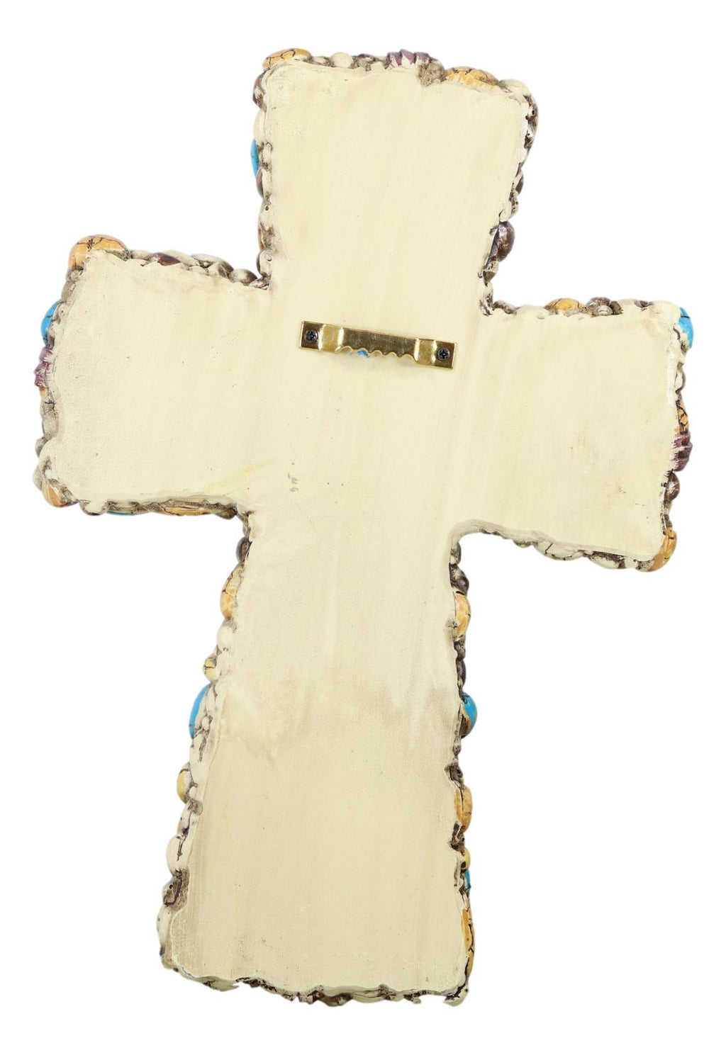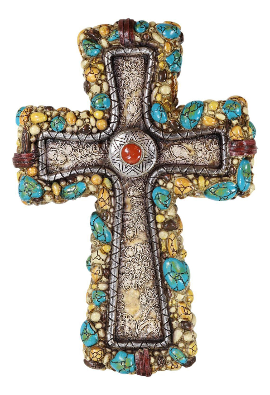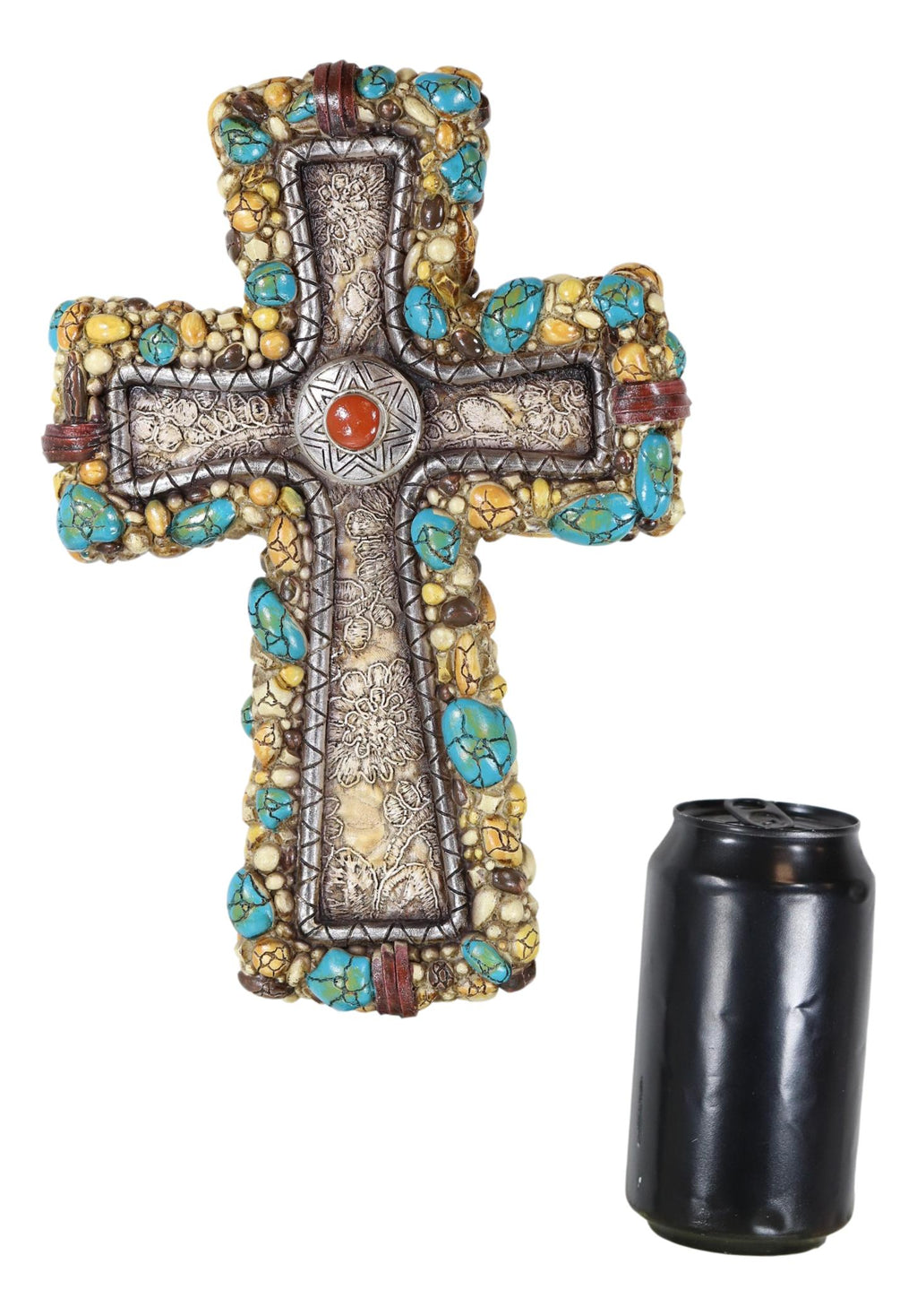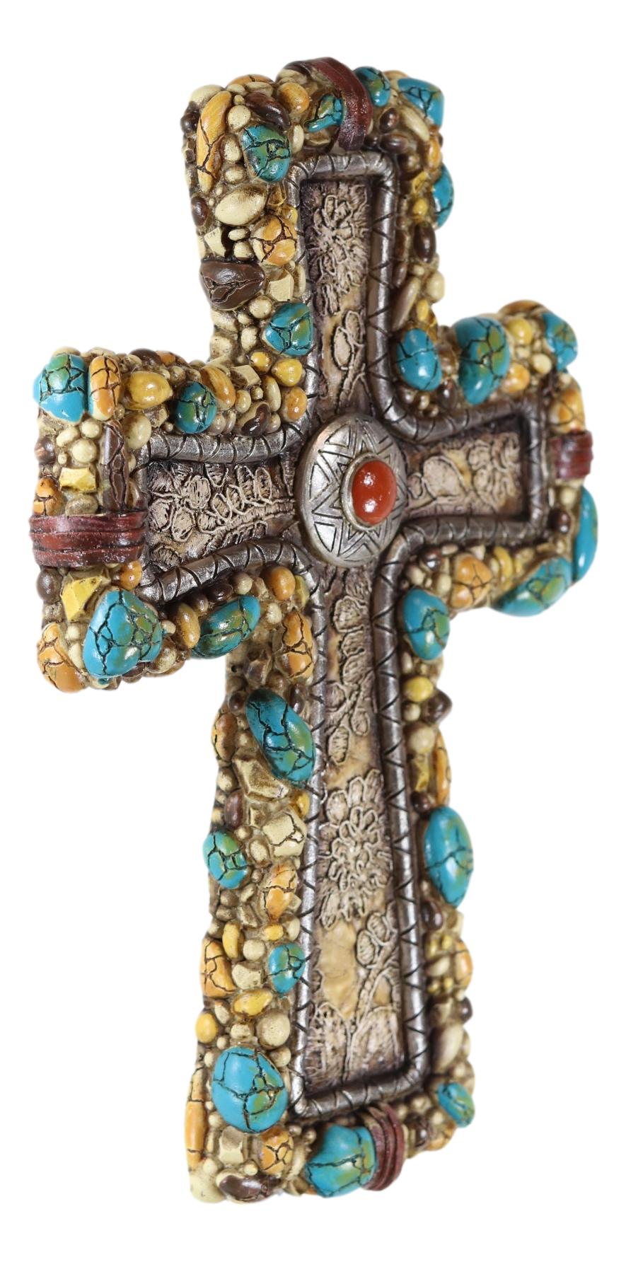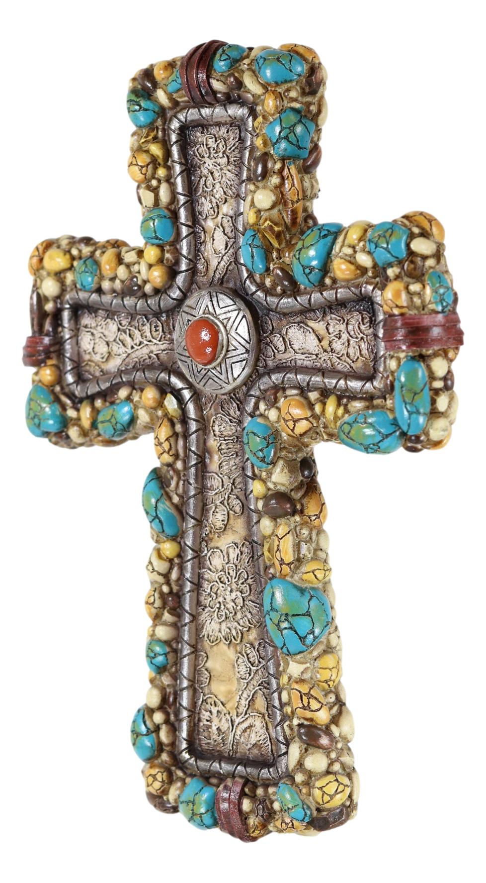 • This Southwestern Turquoise Gemstones Wall Cross will add instant rustic charm to your decore whether it be as a lone cross on the wall or as a collective with other wall decors. The cross is ornate with faux crackled turquoise, yellow and red rocks. Floral filigree art is carved into the center parts of the cross panels.