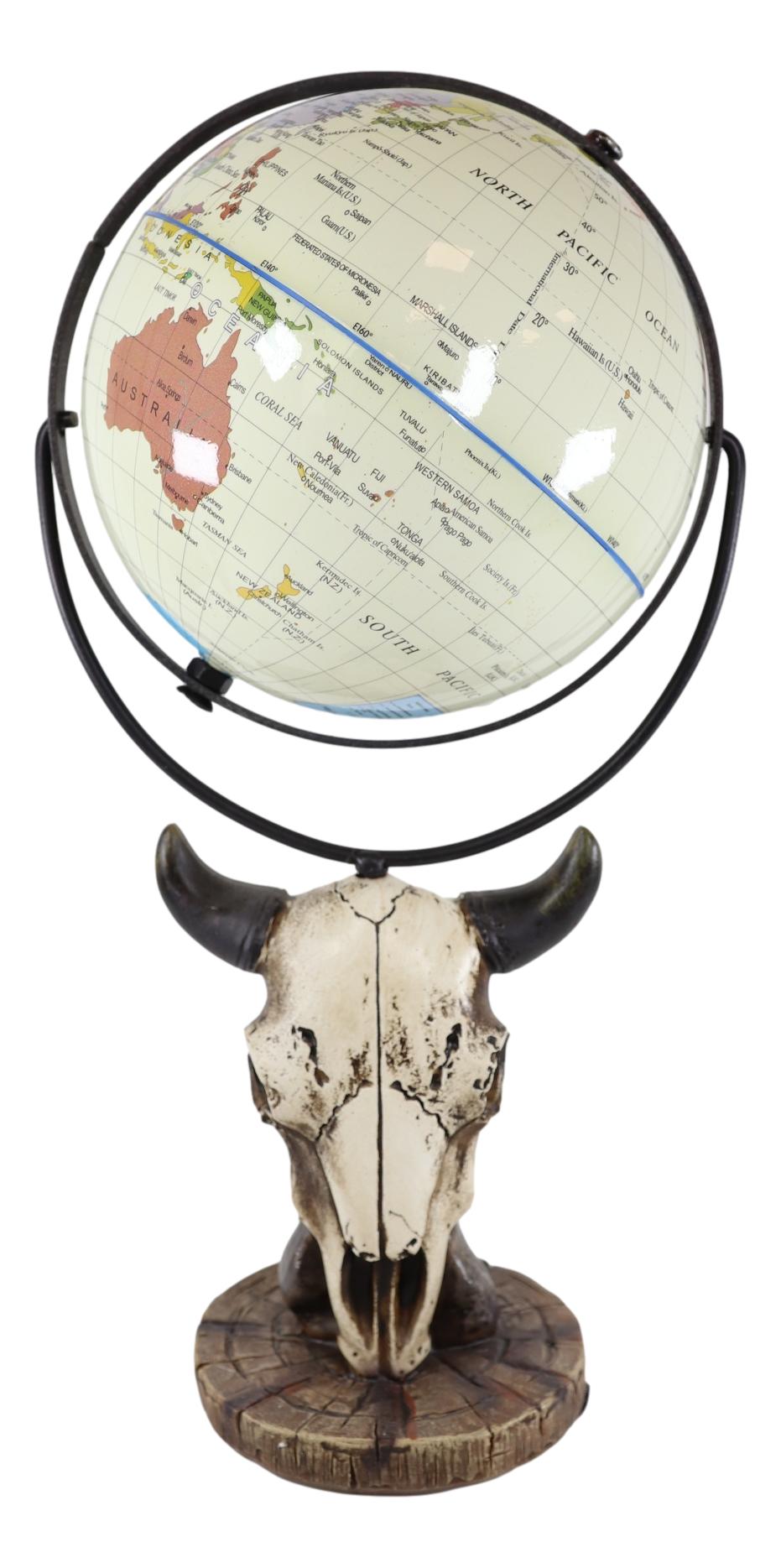 Ebros Rustic Western Bison Bull Cow Skull World Atlas Map Globe Decorative Figurine