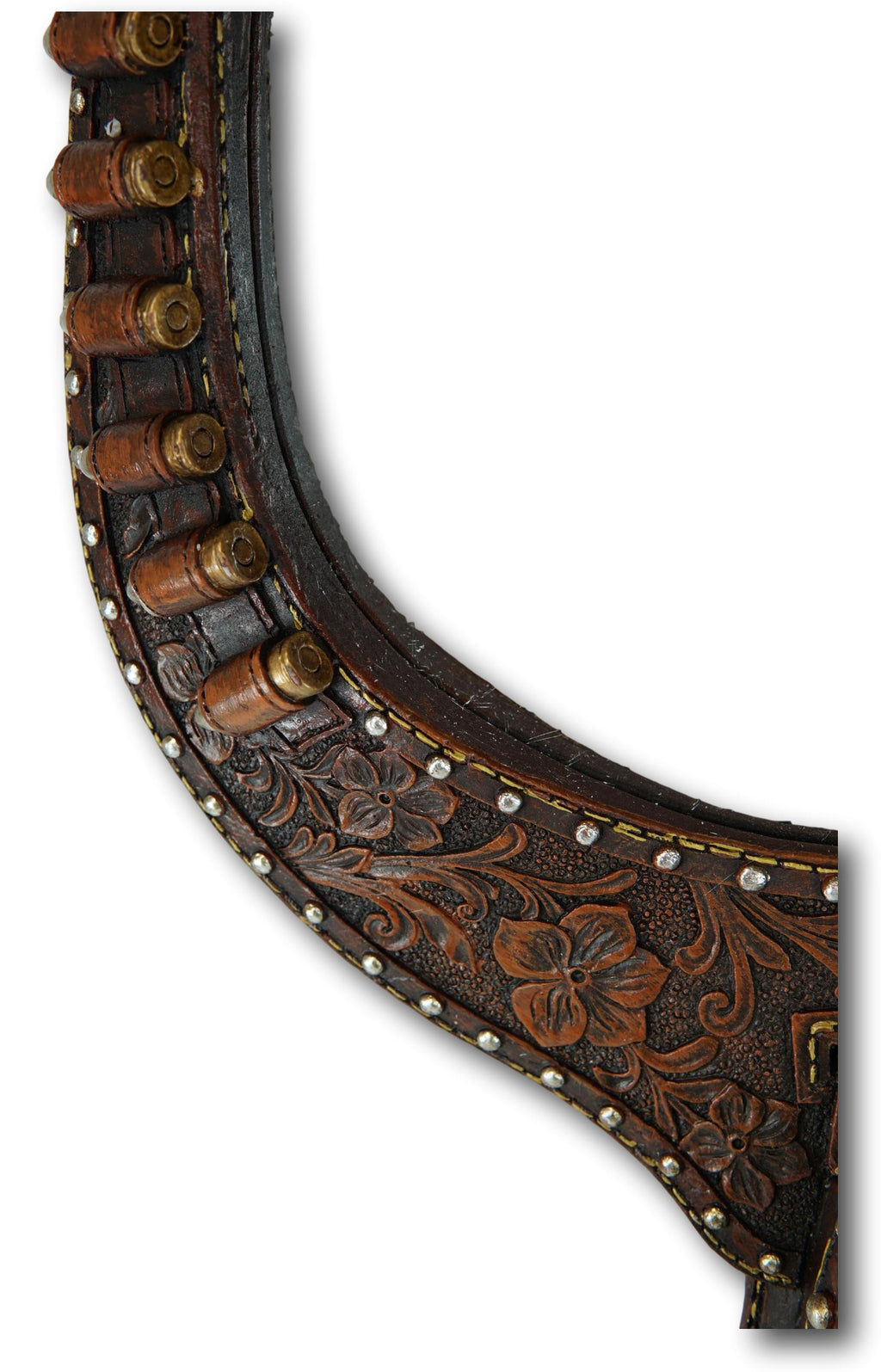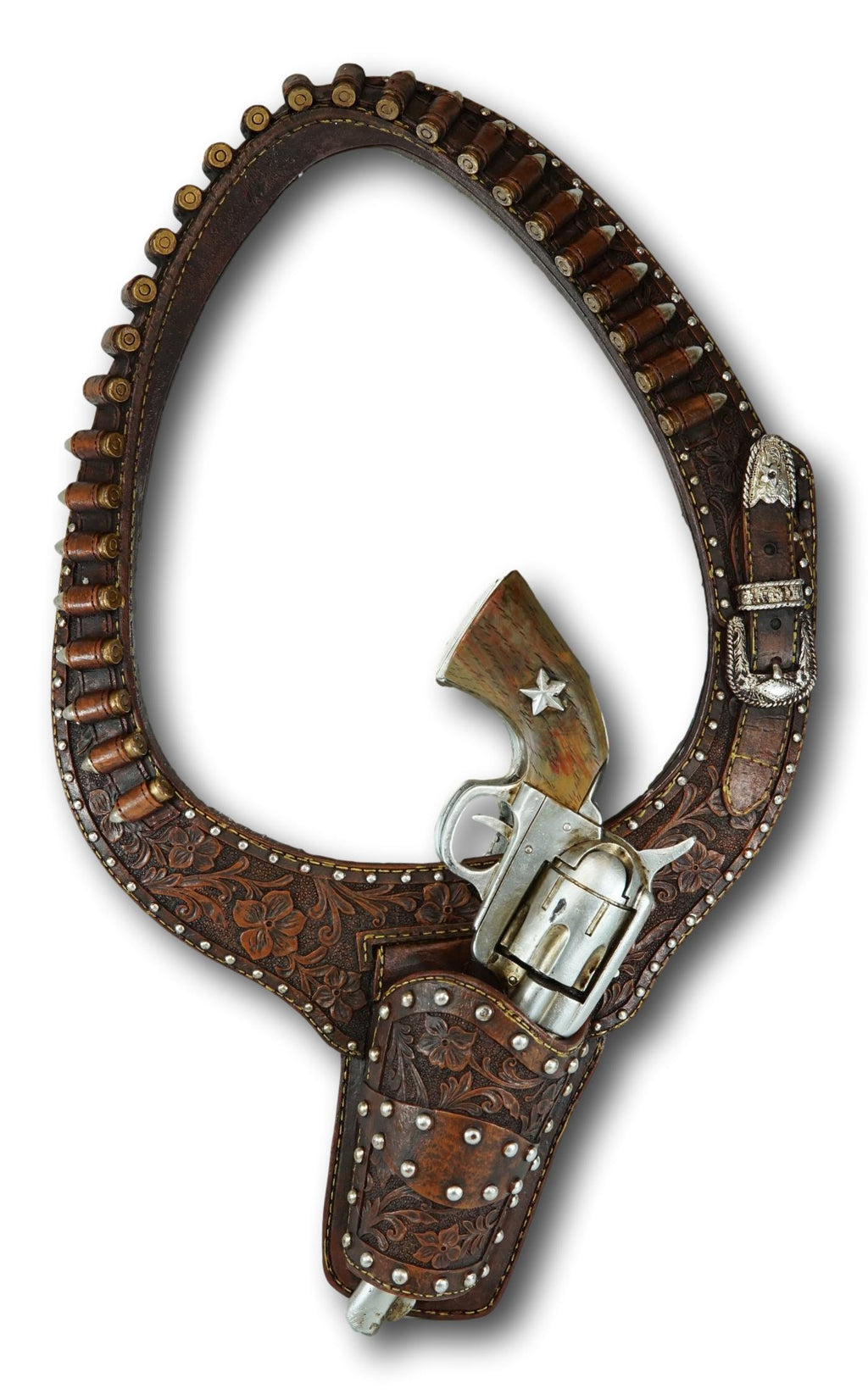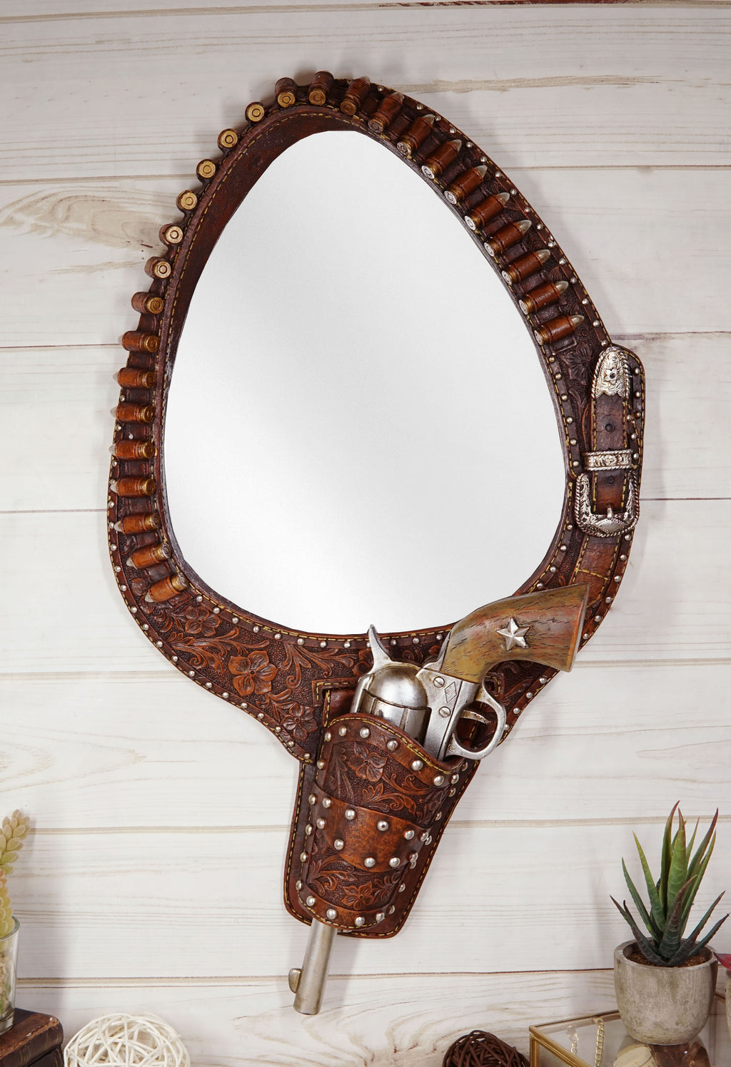 • This Rustic Western Gun Belt With Pistol Wall Mirror is made of fine polyresin, hand painted and polished individually. • This Rustic Western Gun Belt With Pistol Wall Mirror measures 20" High, 12.75" Long and 3" Deep approximately. It weighs about about 3.75 pounds. • A great statement piece western mirror for the bathroom, bedroom or hallway. Showcasing the western cowboy/cowgirl vibe through the faux tooled leather finish sculpting of the mirror. The mirror is bordered by faux tooled leather resin sculpture designed like a gun belt, fully loaded with ammo. A holster is found at the base of the mirror and a revolver pistol fits right into it. The pistol is strictly decorative and can be removed from the holster. • Props in photos are not included with the wall mirror.