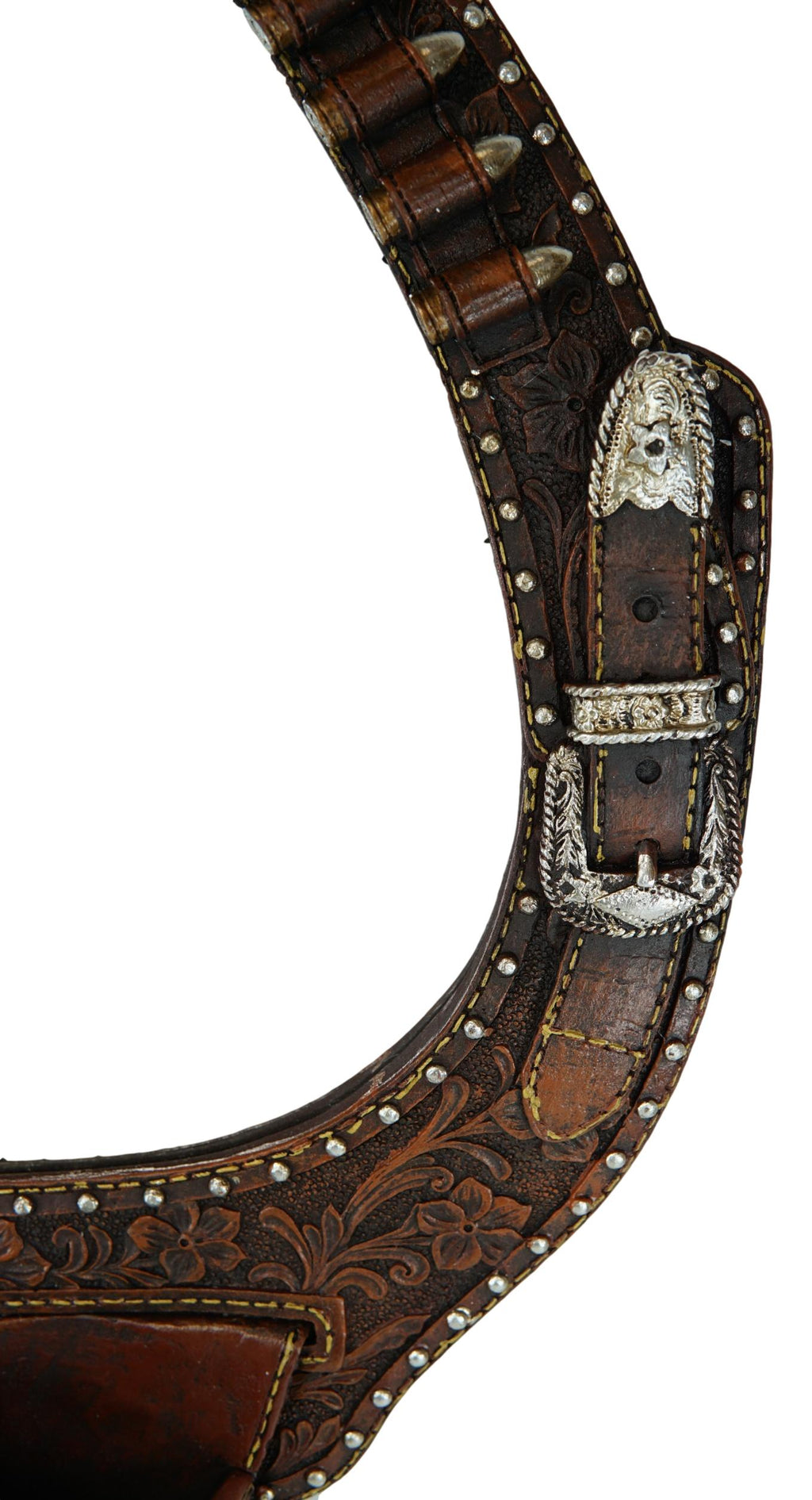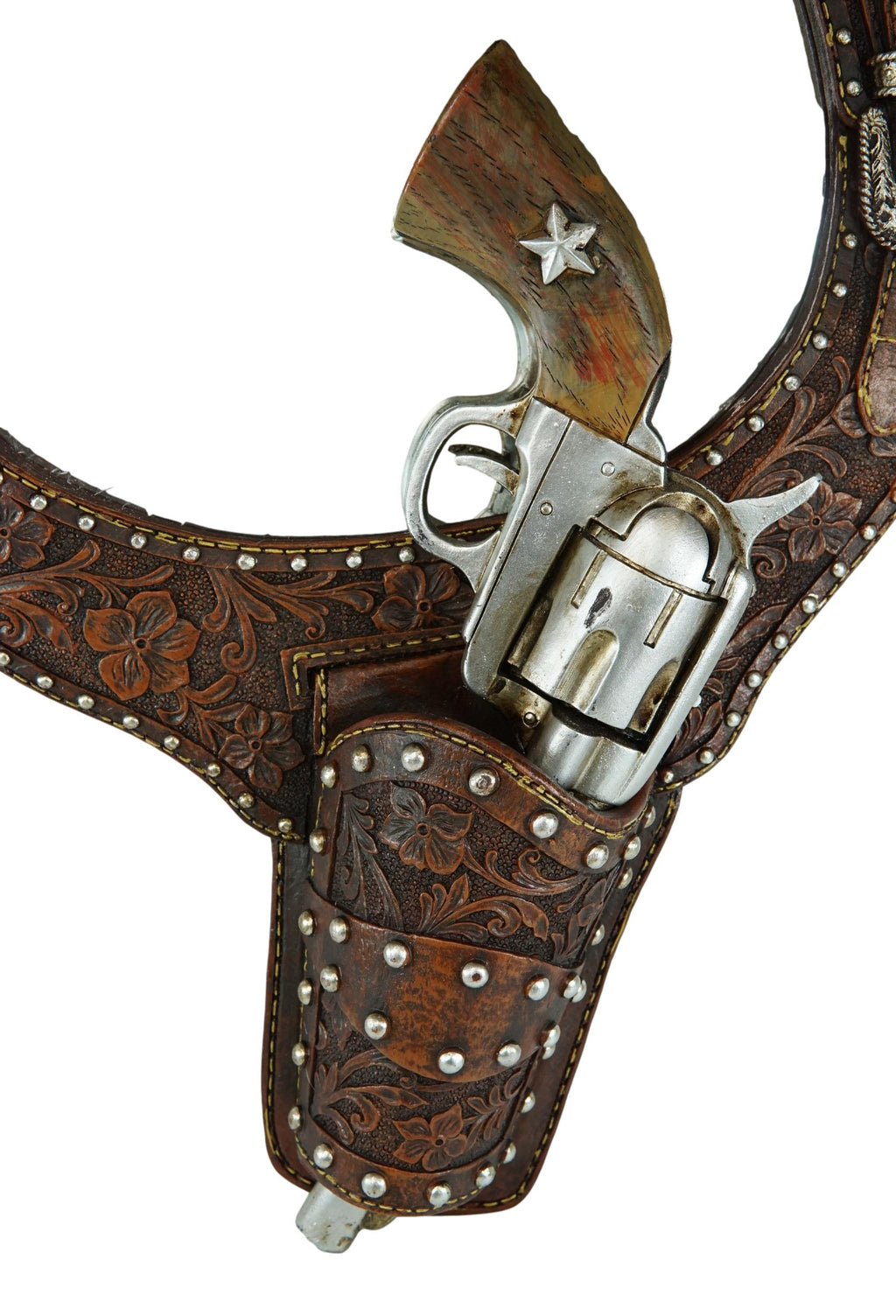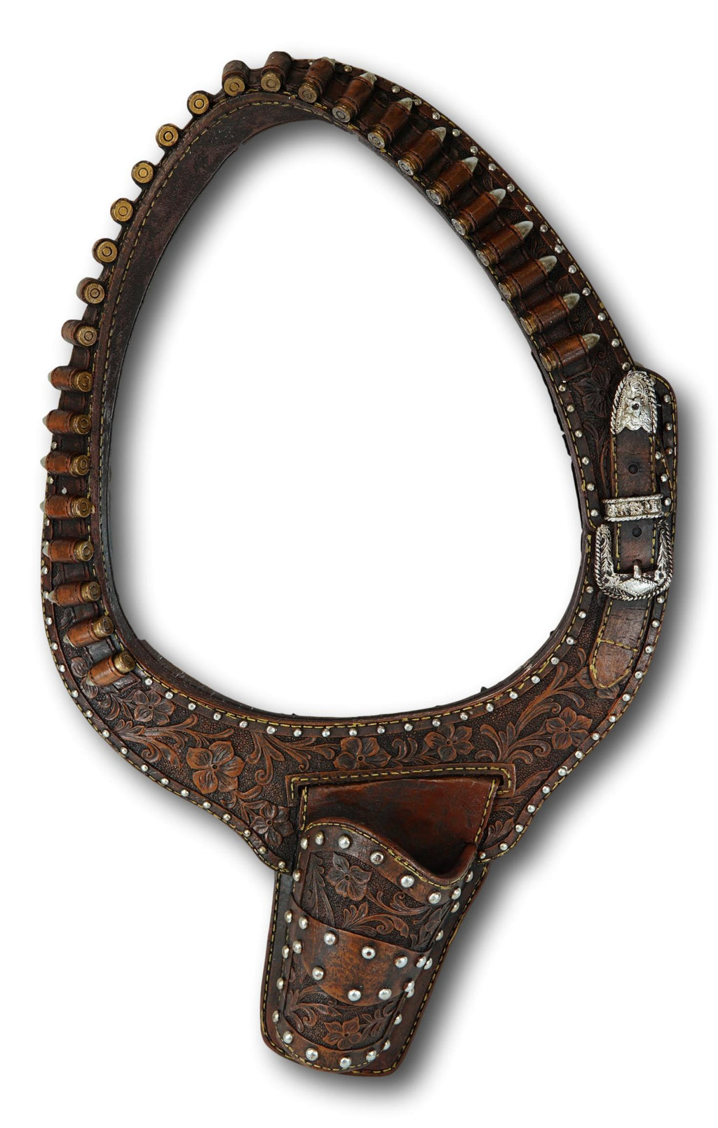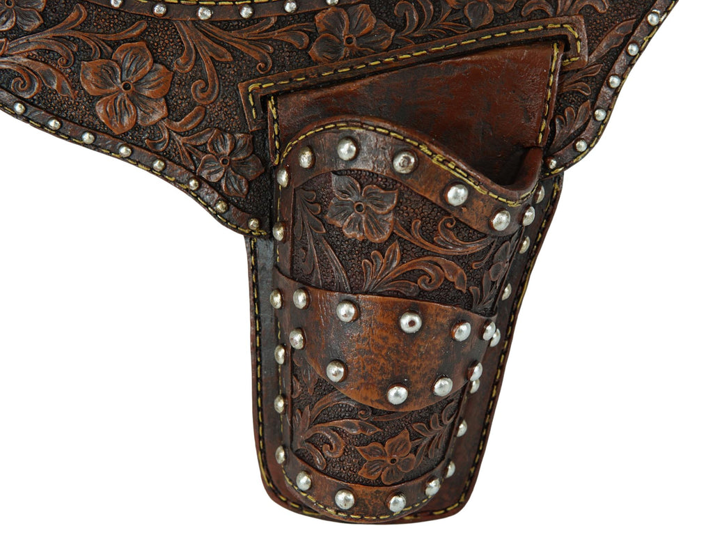 • This Rustic Western Gun Belt With Pistol Wall Mirror is made of fine polyresin, hand painted and polished individually. • This Rustic Western Gun Belt With Pistol Wall Mirror measures 20" High, 12.75" Long and 3" Deep approximately. It weighs about about 3.75 pounds. • A great statement piece western mirror for the bathroom, bedroom or hallway. Showcasing the western cowboy/cowgirl vibe through the faux tooled leather finish sculpting of the mirror. The mirror is bordered by faux tooled leather resin sculpture designed like a gun belt, fully loaded with ammo. A holster is found at the base of the mirror and a revolver pistol fits right into it. The pistol is strictly decorative and can be removed from the holster. • Props in photos are not included with the wall mirror.