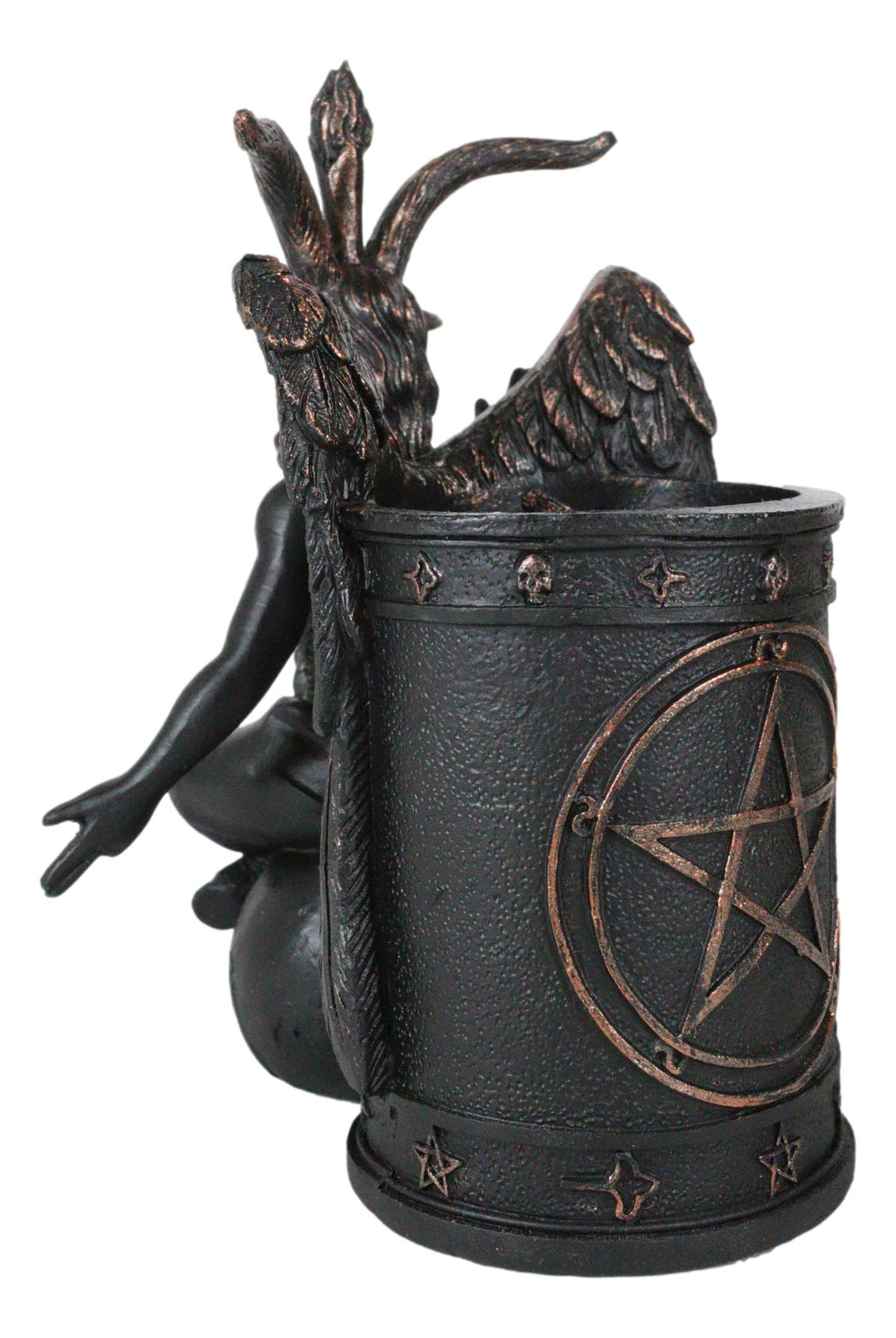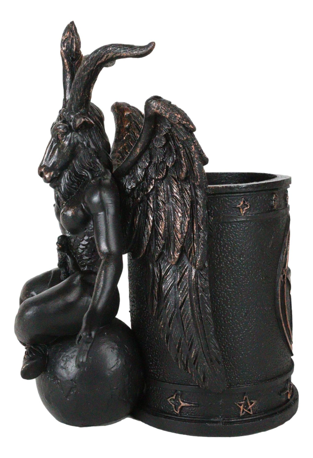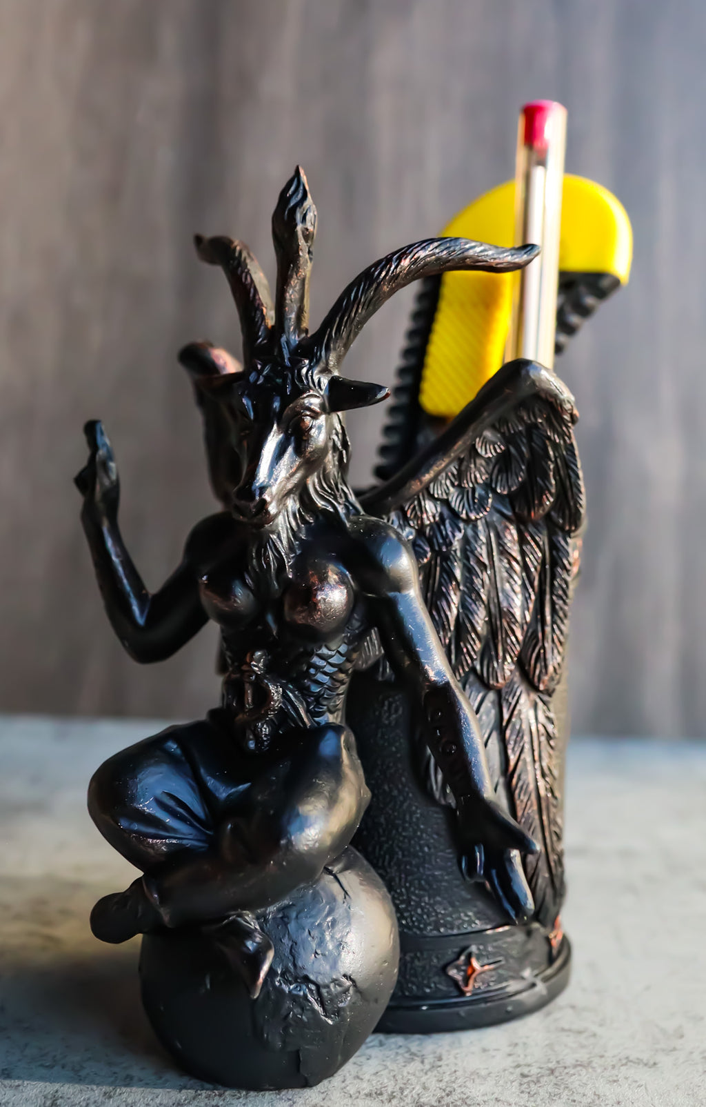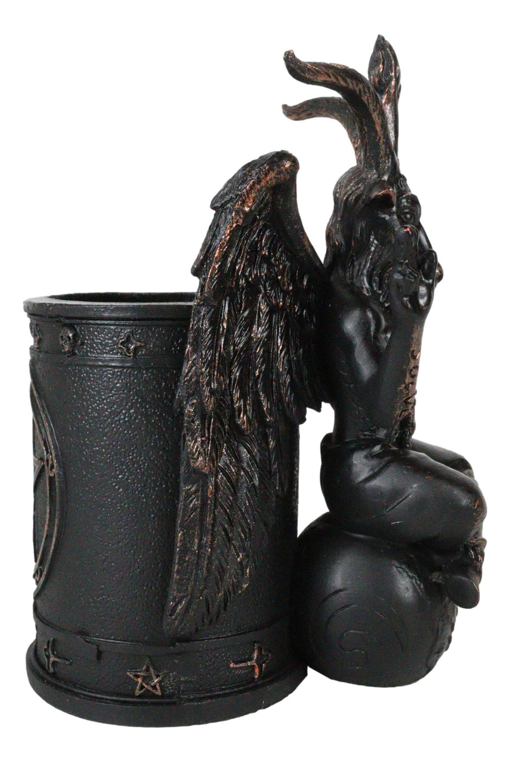 • This Idol Baphomet Pen Holder stands at 5.25" tall, 3.75" long and 3" deep approximately. It weighs about 10 ounces. • This Idol Baphomet Pen Holder is made of designer composite resin, hand painted and polished individually. Stationery and props in the pictures are not included. • Baphomet is an enigmatic, goat-headed figure found in several instance in the history of occultism. From the Knights Templar of the Middle-Ages and the Freemasons of the 19th century to modern currents of occultism, Baphomet never fails to create controversy. • Baphomet embodies the culmination of the alchemical process - the union of opposing forces to create Astral Light - the basis of magic and, ultimately, enlightenment. • Whether you are looking for a functional stationery organizer for your desk or an occultic themed decor for your home, this Baphomet sculpture is the perfect one for you! Starting with the sculpted 3D image of the Baphomet in its original form, we add a cylindrical holder to its back for your stationery. The cylindrical holder contains the sigil of baphomet's pentagram star and its top and bottom borders are marked by symbols.
