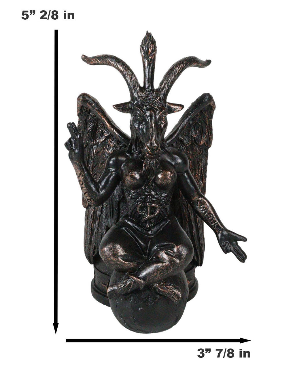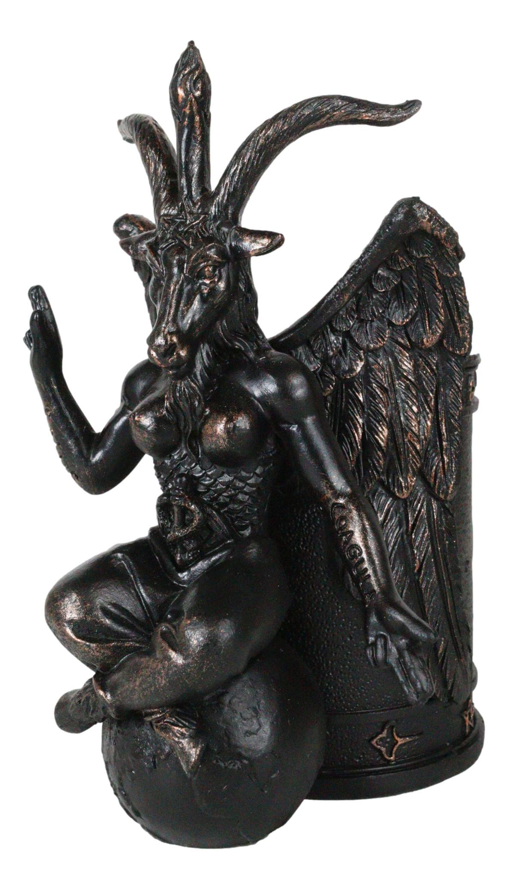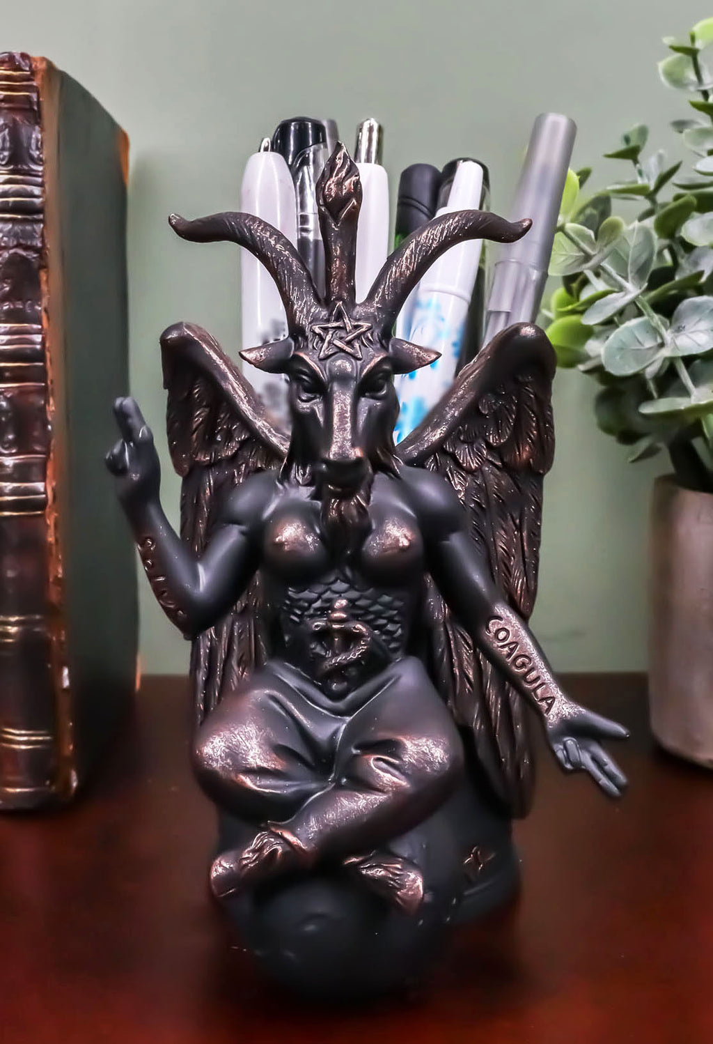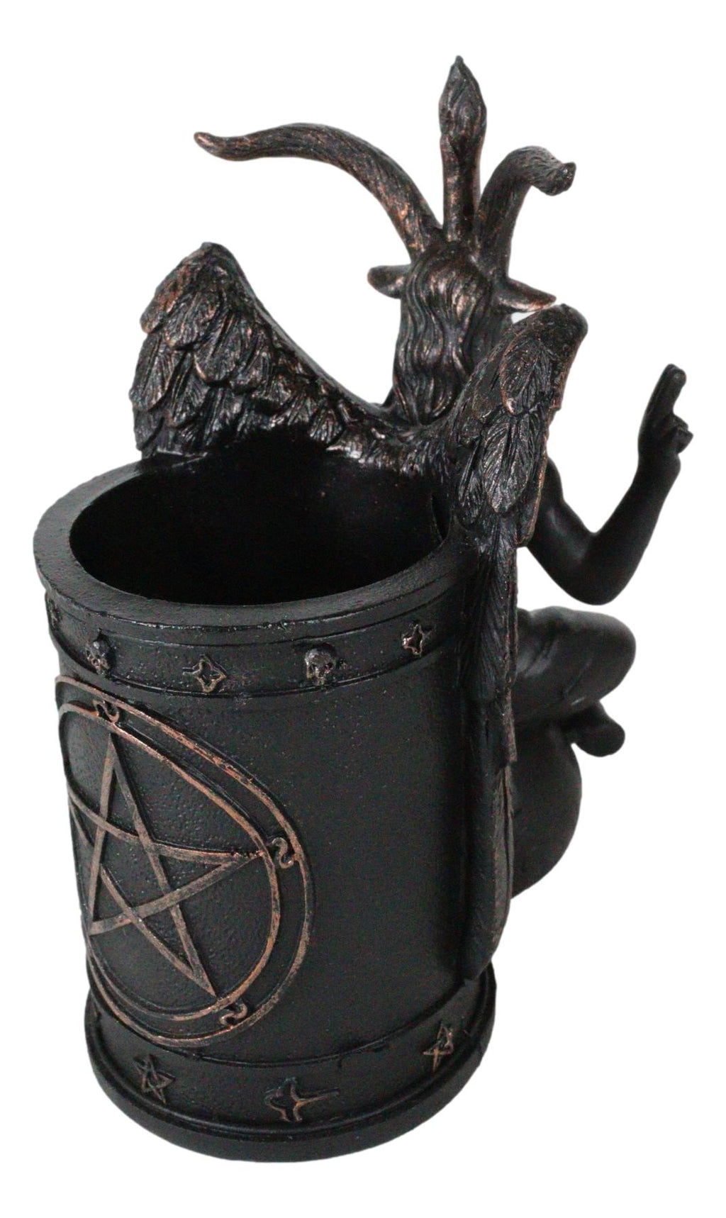• This Idol Baphomet Pen Holder stands at 5.25" tall, 3.75" long and 3" deep approximately. It weighs about 10 ounces. • This Idol Baphomet Pen Holder is made of designer composite resin, hand painted and polished individually. Stationery and props in the pictures are not included. • Baphomet is an enigmatic, goat-headed figure found in several instance in the history of occultism. From the Knights Templar of the Middle-Ages and the Freemasons of the 19th century to modern currents of occultism, Baphomet never fails to create controversy. • Baphomet embodies the culmination of the alchemical process - the union of opposing forces to create Astral Light - the basis of magic and, ultimately, enlightenment. • Whether you are looking for a functional stationery organizer for your desk or an occultic themed decor for your home, this Baphomet sculpture is the perfect one for you! Starting with the sculpted 3D image of the Baphomet in its original form, we add a cylindrical holder to its back for your stationery. The cylindrical holder contains the sigil of baphomet's pentagram star and its top and bottom borders are marked by symbols.