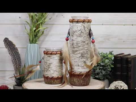 • These candleholders are aesthetically earthy and stunning in design. Starting with a faux birchwood color/design body, the sculpture is embellished with beaded feathers at the sides. The center of the design showcases a large turquoise feather with multi colors and a starry moonlit night scene. Trimmed and bordered in faux rattan and fibrous straws, the candleholder is nothing short of gorgeous!