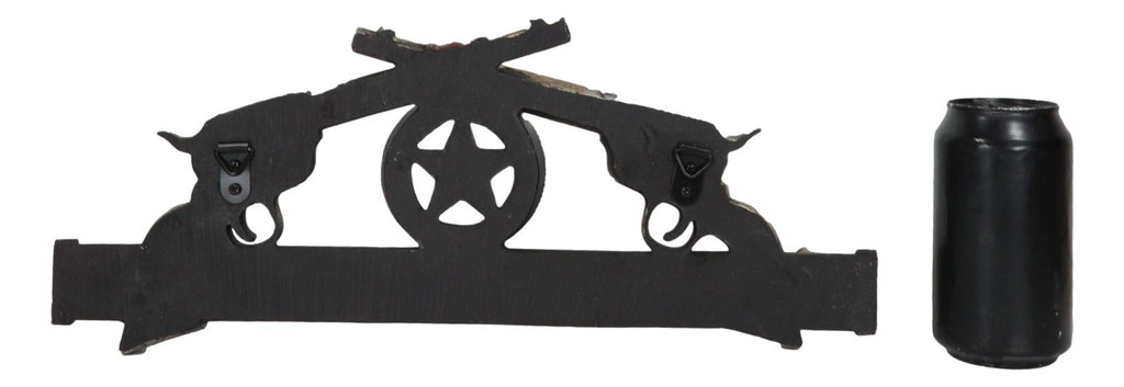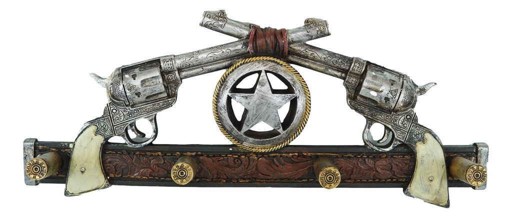 • This Western Star And Pistols Decorative 4-Peg Wall Hooks Decor Sculpture measures 6.5" tall, 16" wide and 2.5" deep approximately. It weighs about 2 pounds. • This Western Star And Pistols Decorative 4-Peg Wall Hooks Decor is made of made of polyresin, hand painted and polished individually. Color tone may vary slightly from pictures. • Rope a Western themed room in the perfect style! Featuring an Old World inspired wild wild west themed 4 peg wall hooks, we make it easy organize your rooms, entrances, patios with rustic charm. The wall hanger features 2 vintage revolver pistols crossed above a Western Star circle. Hanging from the base are 4 light duty bullet ammo sculptural peg hooks for you to hang your coats, leashes, backpacks, clothes and more! • It is highly recommended to anchor your walls prior to hanging this sculpture on your drywalls. Props in photos are not included with the wall decor.