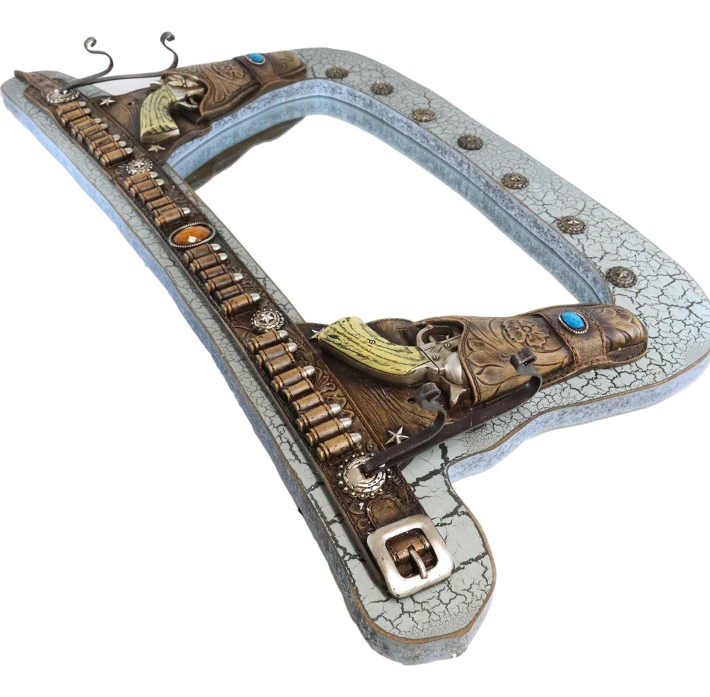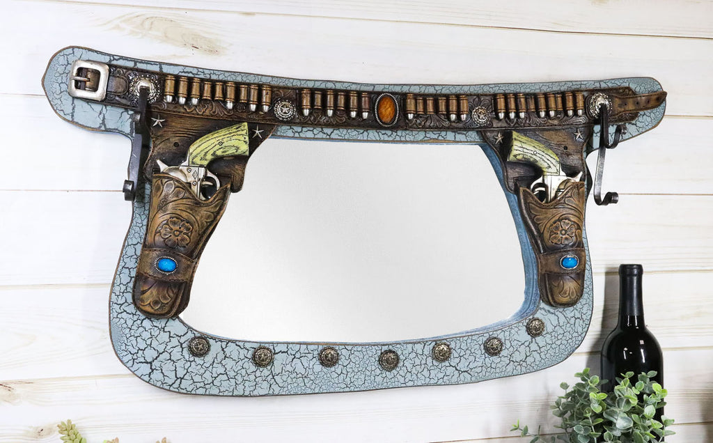 • This Western Revolver Guns In Holster Wall Mirror measures 29" Wide, 14.5" Tall and 4" Thick approximately. It weighs about 11 pounds. • This Western Revolver Guns In Holster Wall Mirror is made of cold cast polyresin, hand painted and polished individually. The two pronged hooks are made of cast iron. • A great western mirror for the bathroom, bedroom or hallway. Showcasing the wild wild west old world vibe through the faux tooled leather finish and crackled paint sculpting of the wall mirror. The mirror is surrounded by western star buttons, gun holster with two pistols and ammo bullets. The holster is also embellished with sunstone and turquoise faux gems. You get the function of the mirror as well as 2 convenient 2-pronged hook spots for your towels and such. • Props in photos are not included with the item.