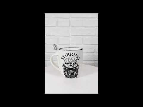 • Stir spells into your coffee with this witchy cup and spoon set! This magical mug is designed to bewitch our brew with the cauldron motif, Stirring Up Spells lettering, and matching Spells spoon. Perfect for cocoa, tea, cider... whatever your dark heart desires.