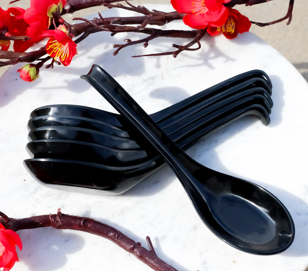• These dining soup spoons are made of high quality melamine in a state of the art factory in China. They are compact/stackable and ergonomic. These restaurant grade melamine spoons are dishwasher safe. Because they are made of melamine, these spoons are perfect for high-volume restaurants and private parties due to its shatter- and stain-resistant properties. Therefore, these spoons will sustain long-term use while maintaining its black color and overall quality.
