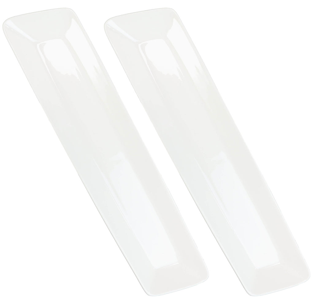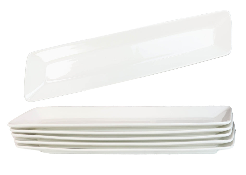 • These slim profile design rectangular rhomboid platters are made of stoneware porcelain, designed and manufactured with superior quality in mind. Our traditionally crafted porcelains are made of the highest quality porcelain available and fired at a high temperature to maximize the strength of the porcelain, making them superior to other ceramics in the market. Our porcelains are more resistant to cracks, stains, and scratches. Our ceramic porcelain is food safe and contain no lead or cadmium. • In the long-standing tradition of fine porcelain dining, these classic serving platters are designed to make every dish an exquisite presentation. Grandly scaled and sleekly designed, they provide an open landscape to put your culinary creations on display. These high-quality platters are crafted for years of dining and entertaining at home. • Each platter measures 14.25" Long, 3.25" Wide and 1" High. The platter has a slight concaved center to present food that may have sauces or are 'slick'. These modern accent plates are dishwasher and microwave safe. • This particular irregularly shaped rhomboid platters are perfect for serving hot or cold dishes; salads, fruits, appetizers, pastas, desserts or what have you at a party or dinner event. Serving food in a white platter creates the perception of grandeur and class for your event. White pottery also allows your colorful food to stand out more! The narrow or slim design of the platters also make them perfect as a spoon/spatula rest to set on your countertop. • This listing is for a pack of 6 14.25" Serving Platters. Props in photos are not included.