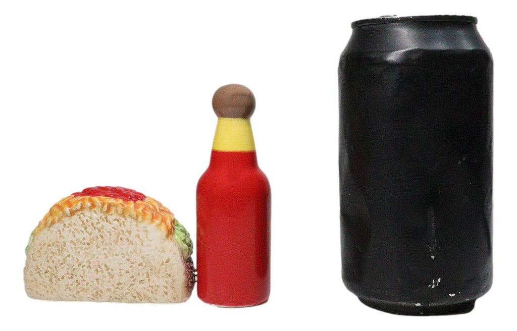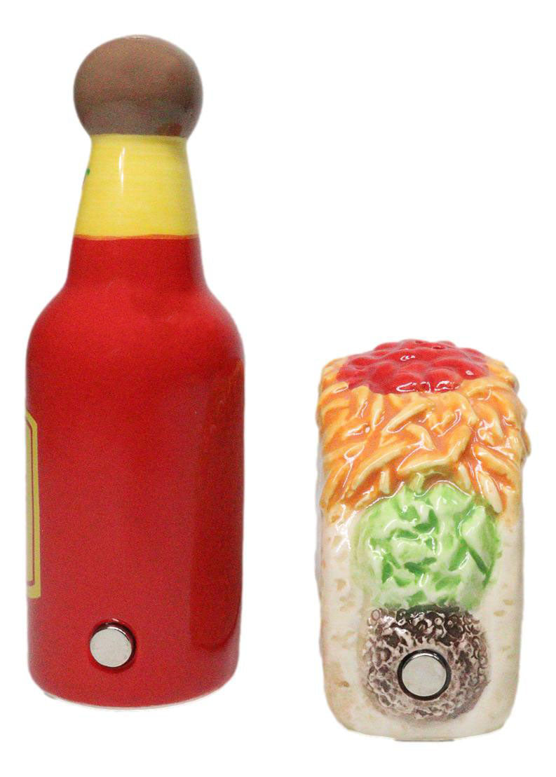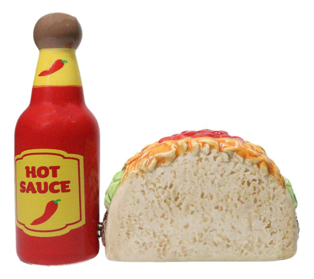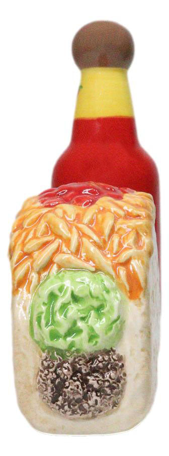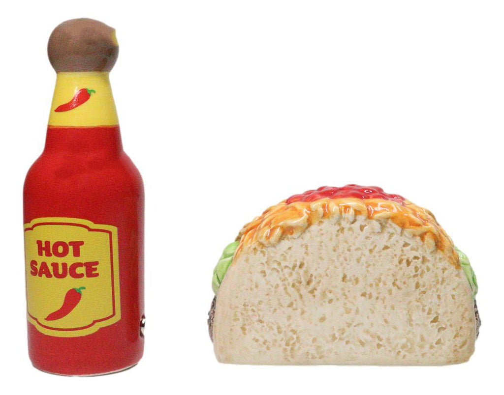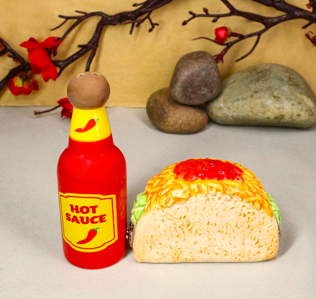 • This Taco Tuesday Salt And Pepper Shakers set measures about 3.25"High, 3" Wide and 1.25"Deep each approximately. They weigh altogether 4 ounces. • This Taco Tuesday Salt And Pepper Shakers set is made of ceramic, hand painted and polished. Color tone may vary slightly from pictures. • Spice up your table with the Taco Tuesday Hot Sauce Bottle and Cheese Taco Salt and Pepper Shakers Set. Playfully designed with bold colors and fun details, this ceramic duo brings festive flair to taco nights and everyday meals. Both functional and decorative, they make a perfect gift for taco lovers, foodies, and fans of quirky kitchen décor. Add a dash of humor and a pinch of flavor to every meal with this lively set that's always ready to fiesta. • Props in photos are not included with the items.