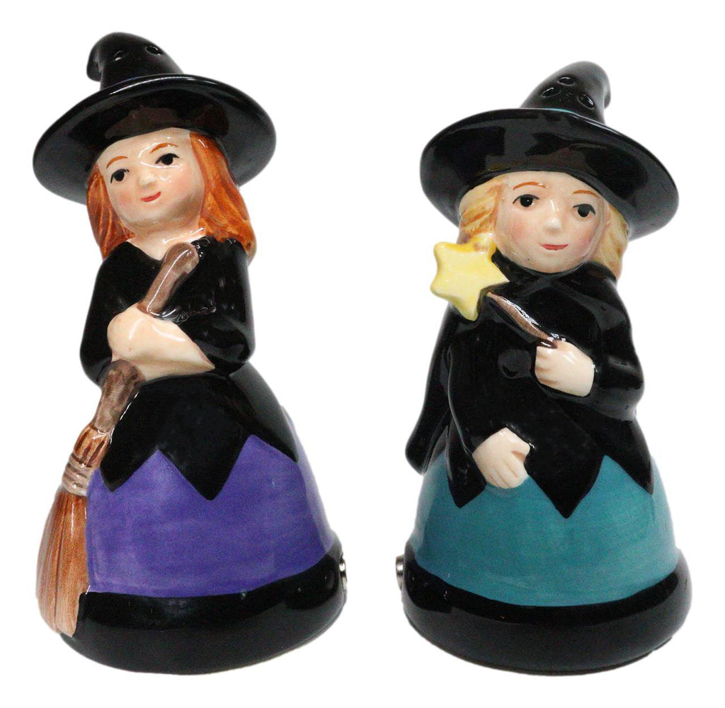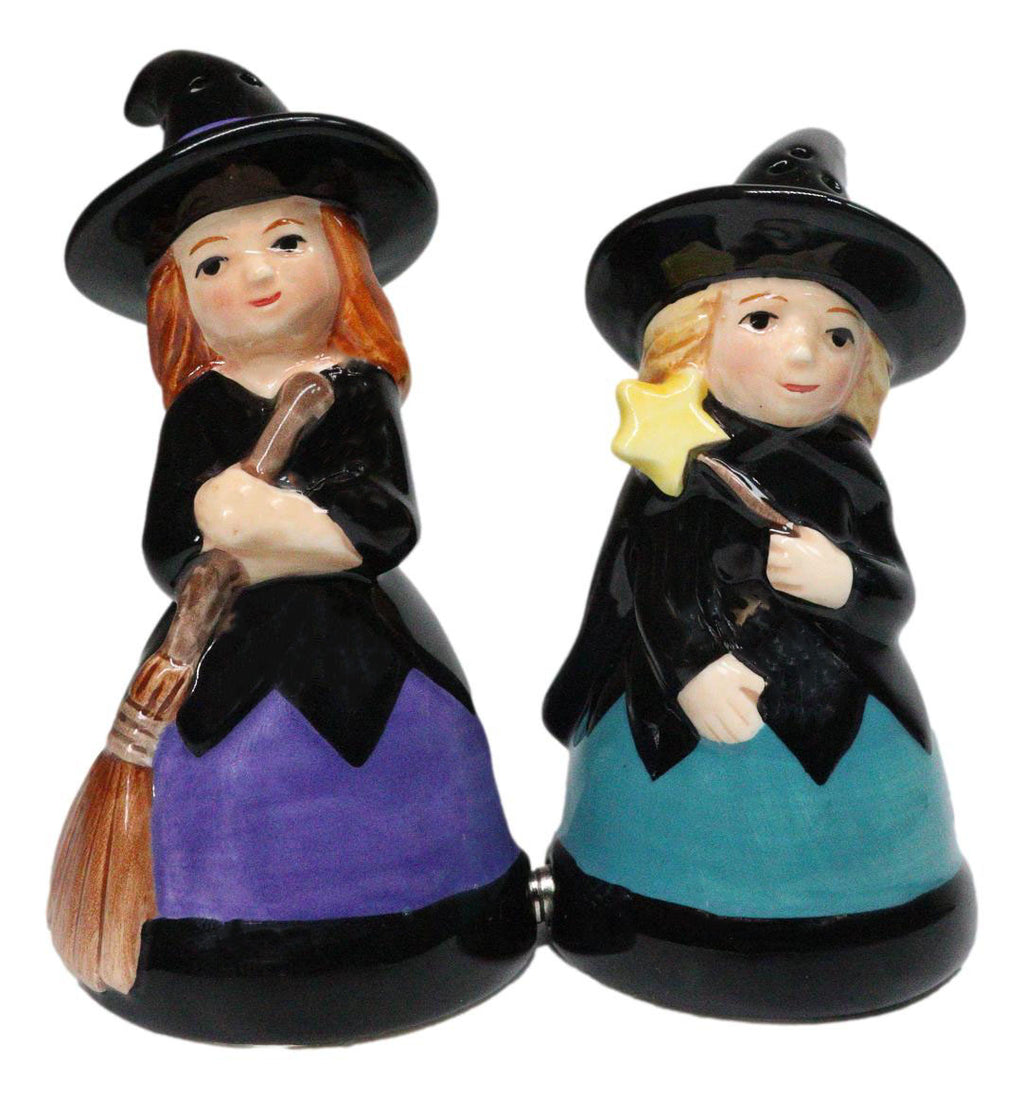 • This Witches Salt And Pepper Shakers Set is made of high quality glossy ceramic, hand painted and polished individually. • This Witches Salt And Pepper Shakers Set measures approximately 4" tall, 2.25" wide and 2.25" deep each. The set weighs about 5 ounces. • Add some flair to your kitchen and dining setup with this awesome salt pepper shaker set. • Cast a spell over your table décor with the Hocus Pocus Witches Ceramic Salt and Pepper Shakers Set. Featuring two charming witches posed with a broomstick and wand, this whimsically detailed ceramic duo blends playful magic with everyday function. Perfect for Halloween entertaining or year-round witchy style, they make a delightful gift for fantasy lovers, collectors, and anyone who enjoys a touch of enchantment in the kitchen. • Props in photos are not included with the shakers.