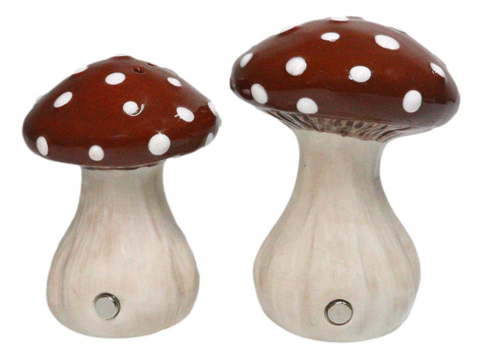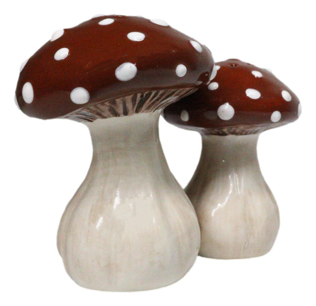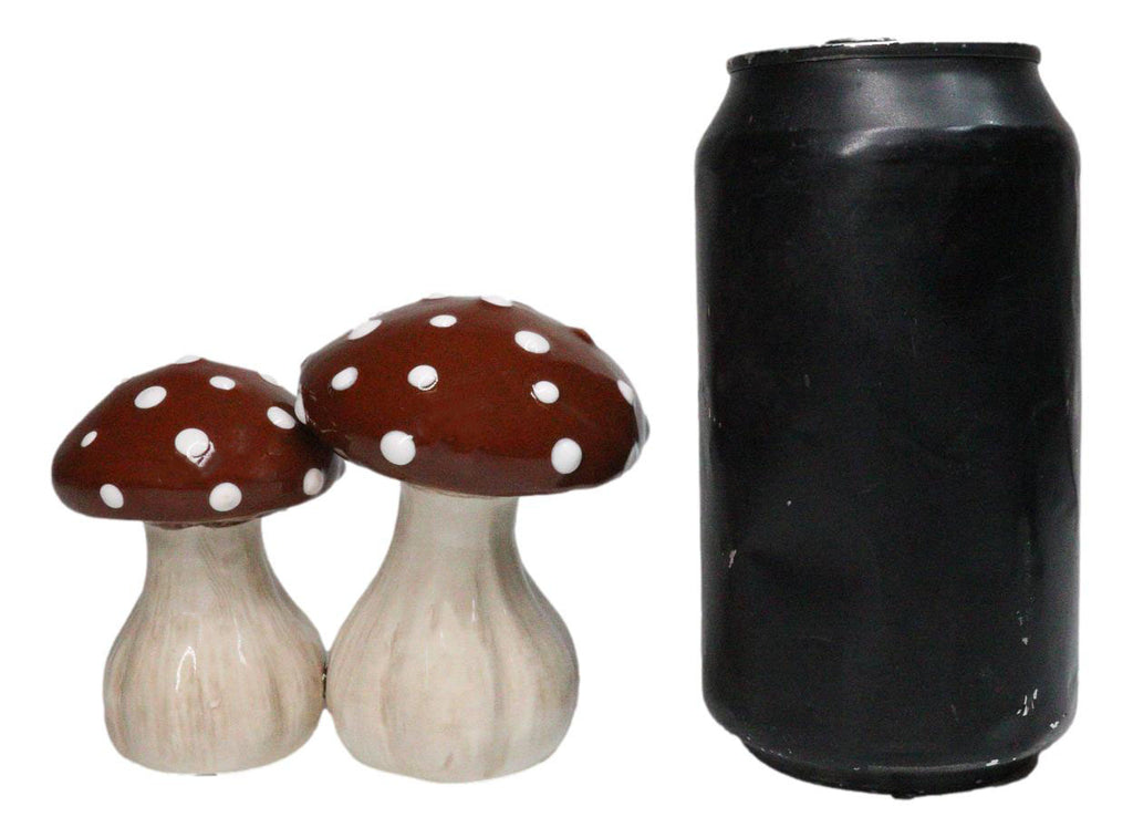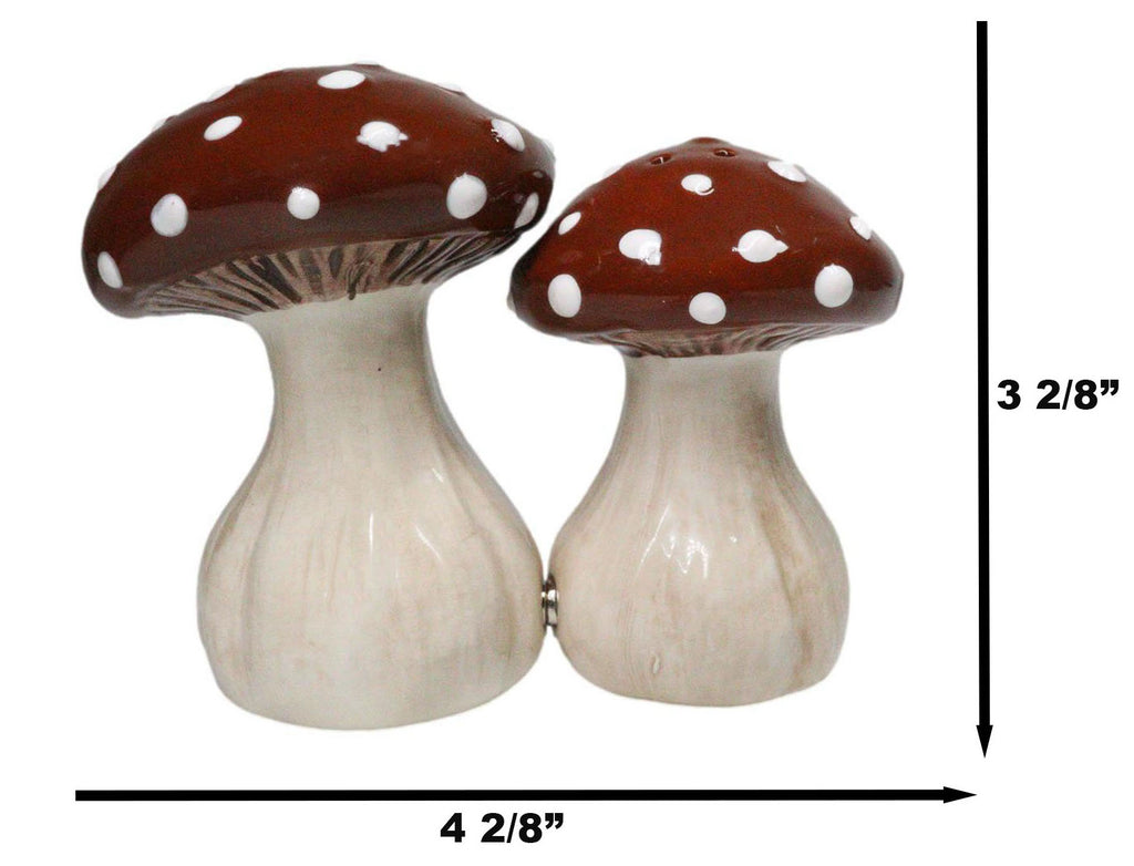 • These Toadstool Mushrooms Salt And Pepper Shakers set measures at about 3.25"High, 4.25" Wide and 2.25"Deep each approximately. They weigh altogether 4.5 ounces. • These Toadstool Mushrooms Salt And Pepper Shakers set are made of ceramic, hand painted and polished. Color tone may vary slightly from pictures. • Bring whimsical woodland charm to your table with these Wild Toadstool Mushroom Salt and Pepper Shakers. Featuring the iconic spotted mushroom design in vibrant red and crisp white, this ceramic set adds playful personality to kitchens, dining tables, and cottage-core décor. Both decorative and functional, they make a delightful gift for nature lovers, fairy-garden fans, and collectors of charming tabletop accents. • Props in photos are not included with the items.