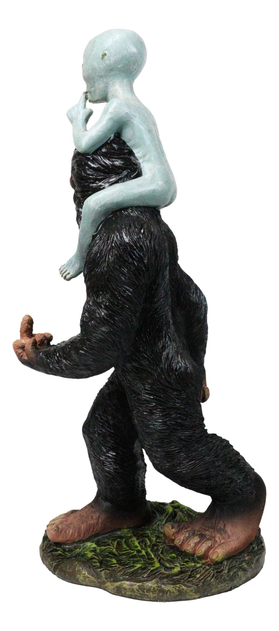• This Bigfoot With Alien Figurine measures 14.75" tall, 7" long and 6" deep approximately. It weighs about 2.25 pounds. • This Bigfoot With Alien Figurine is made of designer composite resin, hand painted and polished individually. • Add a hilarious twist to your collection with this Sasquatch Bigfoot Carrying ET Roswell Alien Figurine. This bold and funny statue features Bigfoot giving a cheeky gesture while carrying his extraterrestrial buddy on his shoulders, blending legendary folklore with sci-fi humor. Expertly detailed and full of attitude, it's the perfect conversation piece for man caves, game rooms, or fans of cryptids and aliens alike. A must-have for anyone who loves weird, wild, and wonderfully unique décor! • Props in photo are not included with the item.