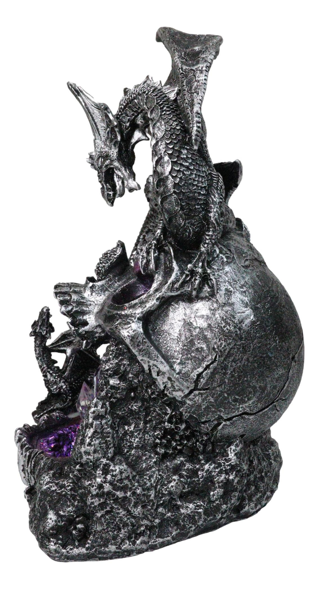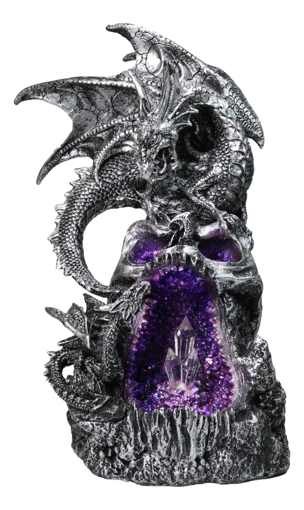 • This Silver Dragon On Giant Skull Figurine is approximately 11.25" tall, 7" long and 6.75" deep (inches). It weighs about 2.25 pounds. • This Silver Dragon On Giant Skull Figurine is made of designer composite resin, hand painted and polished individually. • This is a gorgeous and stunning piece of art. Our sculptors and painters have done an excellent job in creating great details to the dragon. Display this centerpiece in your home or garden and watch it gain admiration from all eyes that see him. • Unleash dark elegance with the Silver Gothic Dragon Perching on Oversized Skull Figurine. This striking piece showcases a majestic silver dragon with intricate gothic detailing, poised powerfully atop a massive skull embedded with shimmering faux quartz crystals. The metallic sheen and sculpted textures create a captivating balance of fantasy and mystery, evoking the power of ancient legends. Perfect for gothic décor, dragon enthusiasts, or fantasy art collectors.