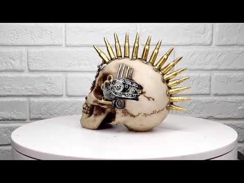 • Decorate your home for the halloween, day of the dead season or any season with this skull. Branded as an aristocrat of the Steampunk City of Zog, this skull is adorned with gearwork eyes and many other pressure gauge accessories. On top of its extra cool gearwork features, we added bullet spike hair on his head, making him a very cool steampunk skull masterpiece!