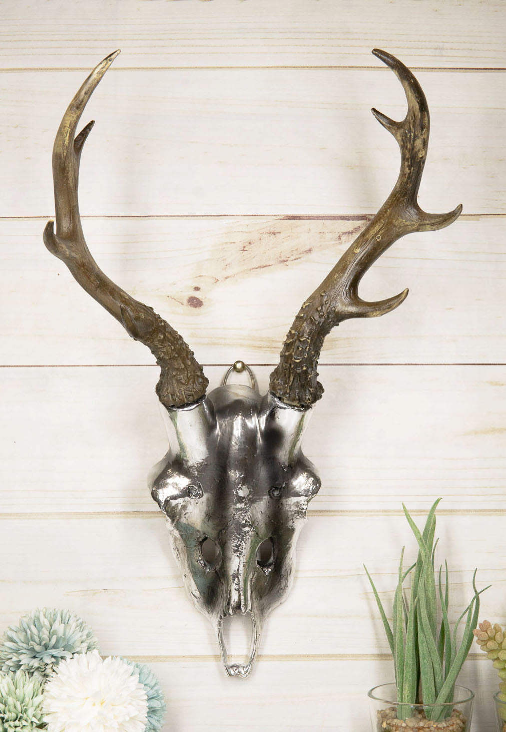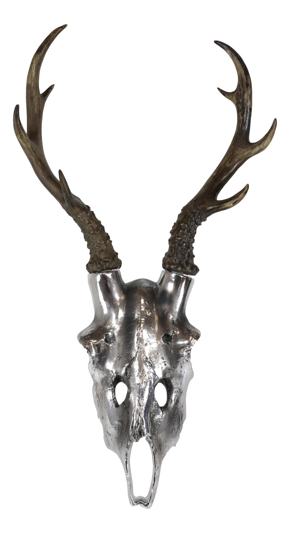 • This Rustic Stag Deer Skull Bust Wall Decor measures 16.5" tall (includes the horns), 8.5" wide and 5.5" deep approximately. It weighs about 1.75 pounds. • This Rustic Stag Deer Skull Bust Wall Decor is made of designer composite resin, hand painted and polished individually in silver metallic finish. • Transform your living space walls with this striking work of natural art! Sculpted in resin medium, it is hand painted by our expert painters to bring a still figurine to a lively resemblance in metallic silver finish. Place this deer bust skull statue where it's sure to be noticed and be prepared to hear the many admiring comments from family and guests alike! The perfect decorative centerpiece for any rustic lodge or hunting cabin décor. • Props placed next to the figurine is not included with the listing. They are meant to provide size perspective of the item.