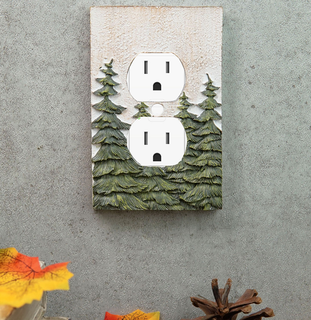 • A simple change can make a huge impact on the look and feel of any room. Something as simple as a switch plate; Get rid of the mundane plain plastic switch plates on your walls and replace them with these rustic pine trees forest plates! Textured on the background and hand painted, the wall plates paints a picture of an evergreen pine trees forest swaying with the wind. These switch plates go well with rustic, farmhouse, cabin, lodge, cottage, western and country decors!