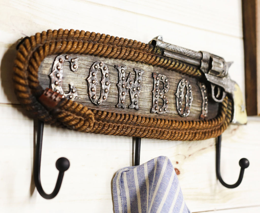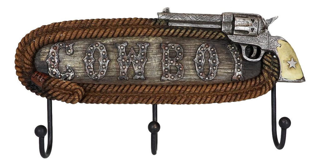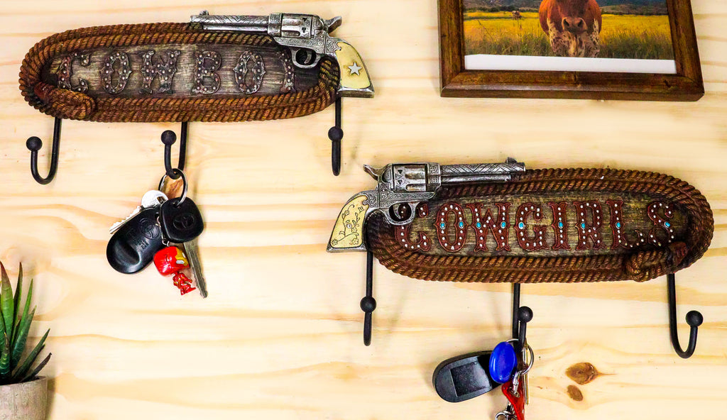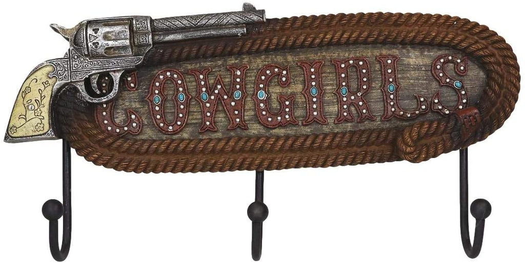 • This Cowboy/Cowgirl Decorative 3-Peg Wall Hooks Decor Sculpture measures 6" tall, 12" wide and 1.75" deep approximately. It weighs about 1.25 pounds. • This Cowboy/Cowgirl Decorative 3-Peg Wall Hooks Decor Sculpture is made of polyresin (metal hooks), hand painted and polished individually. Color tone may vary slightly from pictures. • Rope a Western themed room in the perfect style! These cowboy and cowgirl signs with 3 peg hooks will organize your rooms, entrances, patios with rustic charm. The wall hangers feature vintage revolver pistol at one corner and braided ropes that encompasses the worded sign of your choice. Hanging from the base are 3 metal peg hooks for you to hang your coats, leashes, backpacks, clothes and more! • This is an Ebros exclusive collection. Props in photos are not included with the listing. This listing is for a pack of 2 wall hooks.
