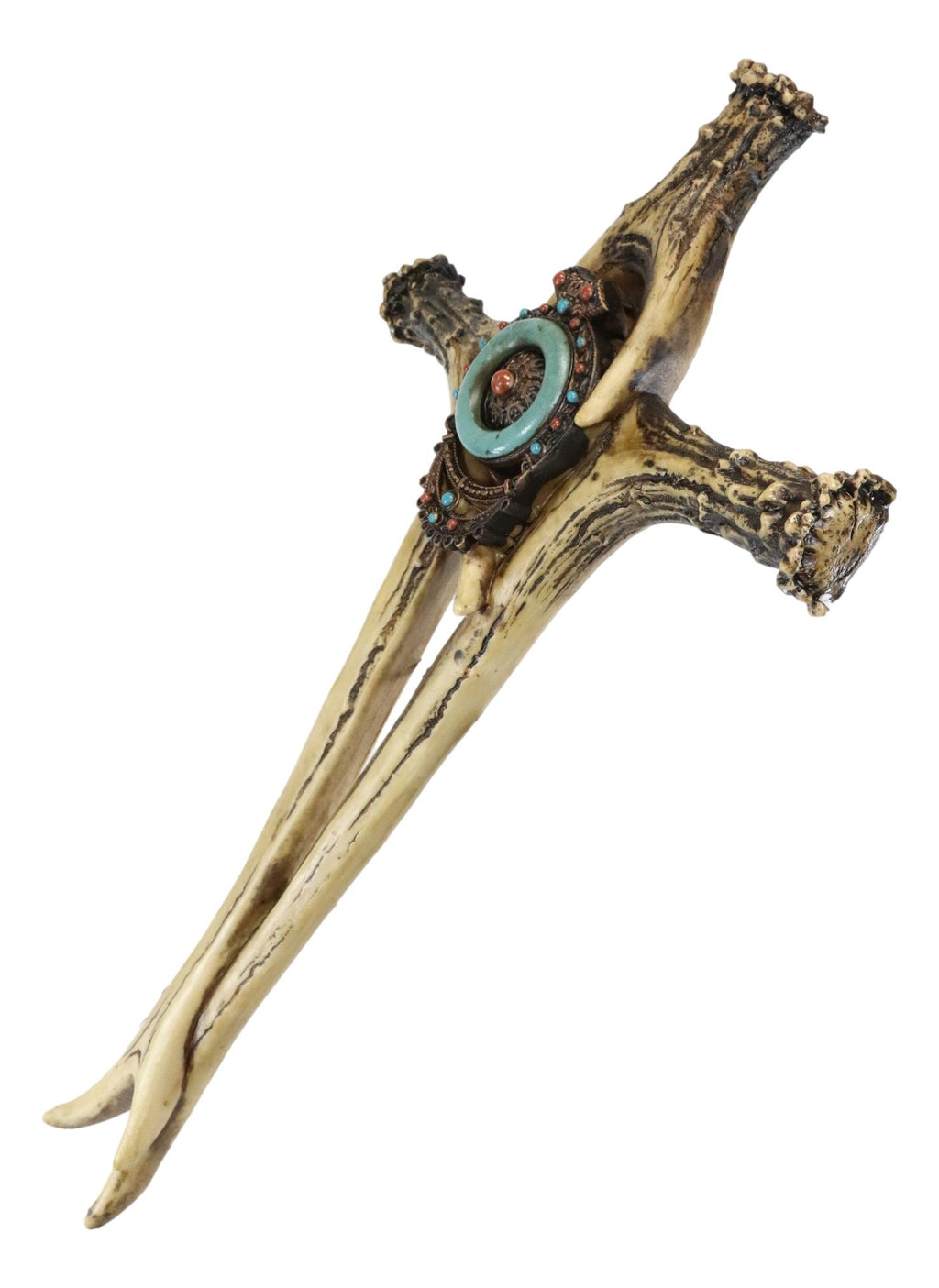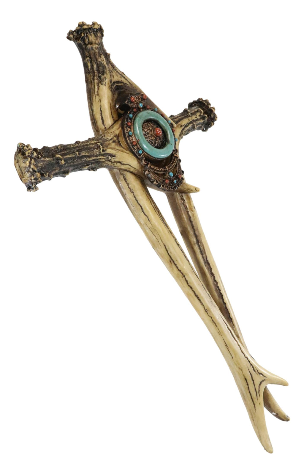 Ebros Turquoise Gemstones Ring On Intertwined Buck Deer Antlers Bone Wall Cross Decor
