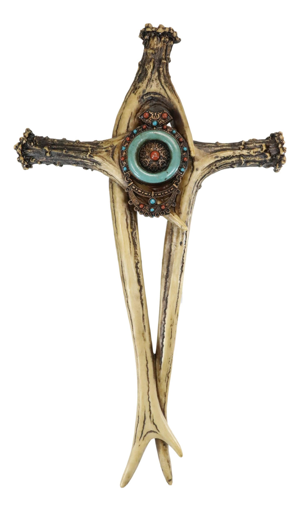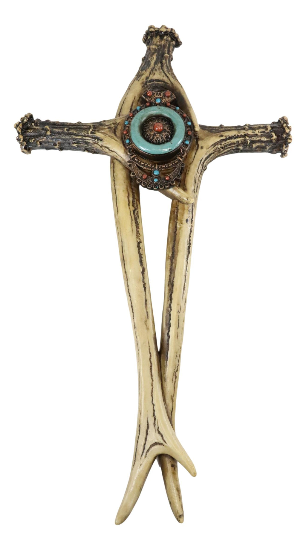 • The wonderful wall cross is perfect as a lone decor on your wall or as a collage with other wall decors or crosses. The cross is comprised of bone deer antlers intertwined together. Turquoise gemstones and red vial stones in the center of the cross embellishes the vintage wall decor.