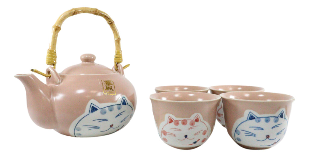 Ebros Auspicious Maneki Neko Lucky Fortune Cat Pink Ceramic Tea Set W/4 Cups