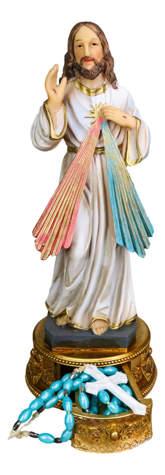 • This Divine Mercy Of Jesus inspirational figurine measures 9.25" tall, 4" long and 3.75" deep. It weighs about 13 ounces. • This Divine Mercy Of Jesus inspirational figurine is made of designer composite resin, hand painted and polished individually. • This sculpture of Divine Mercy is hand painted and casted in high quality resin. The Divine Mercy is a devotion to the merciful love of God and the desire to let that love and mercy flow through one's heart towards those who needs it. The image of Divine Mercy shows Jesus raising His right hand in blessing, and the left pointing to His heart with rays streaming out with red symbolizing the blood of Jesus and the other symbolizing water. • Celebrate your faith with the Divine Mercy of Jesus Christ Figurine-a beautiful devotional keepsake that brings peace, grace, and inspiration into your home. This elegant piece features the tender image of Jesus Christ as the Divine Mercy, paired with a built-in drawer perfect for storing your rosary or other cherished sacramentals. • Props and rosary in photos are not included with the item.
