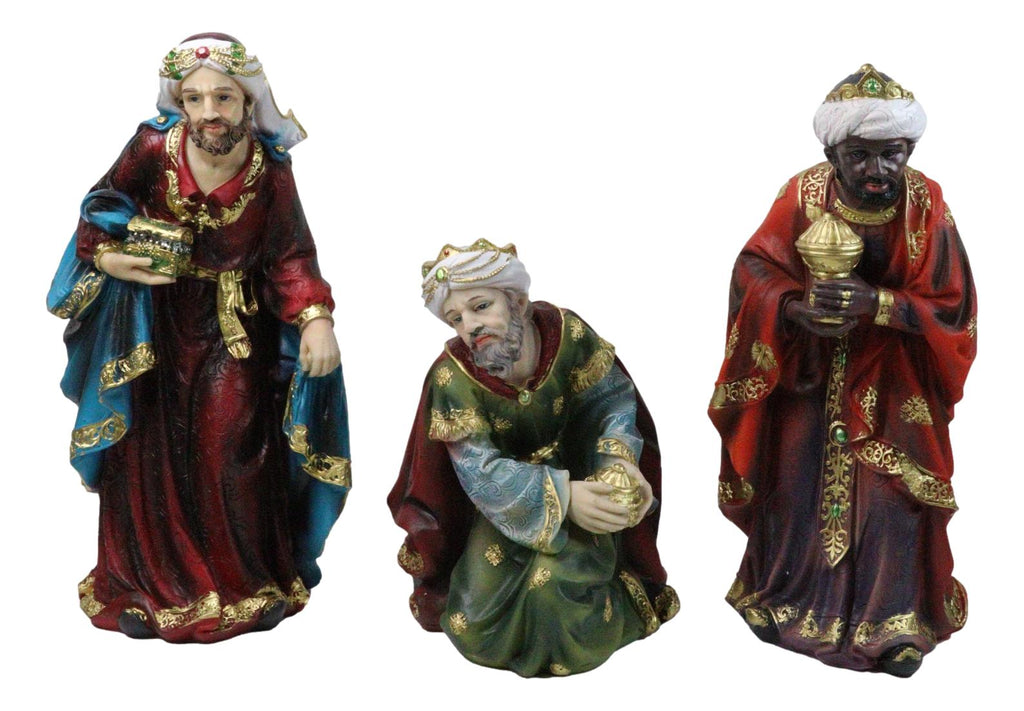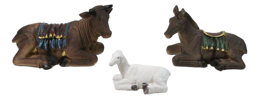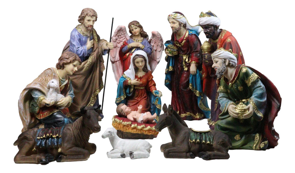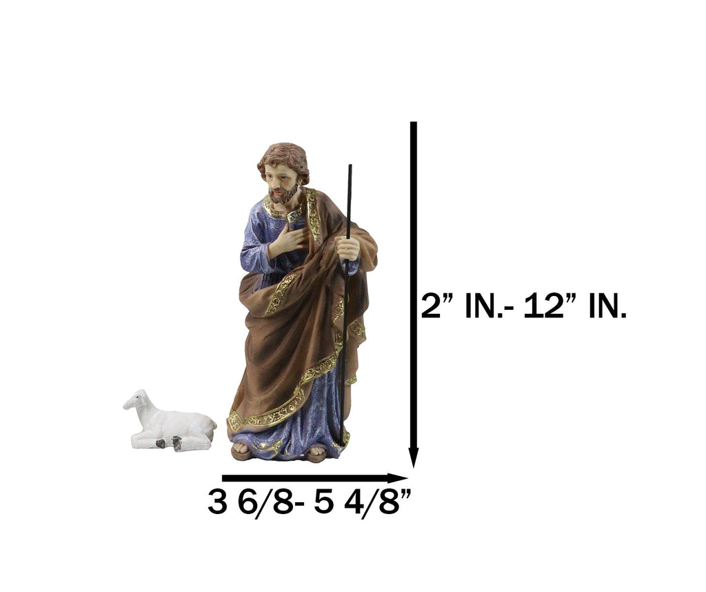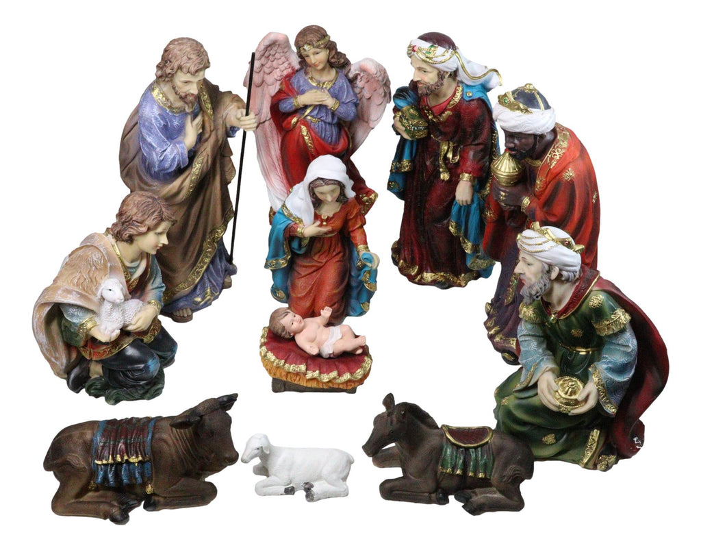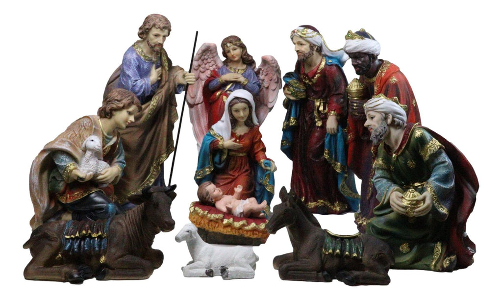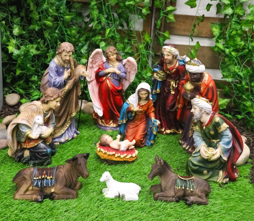 • This Beautiful Nativity Figurines Set measures 2"-12" tall, 3.5"-5.5" long and 2"-5" deep approximately. The set weighs about 13 pounds. • This Nativity Sculpture Set is made of designer composite resin, hand painted and polished individually. Color tone may vary slightly from pictures. • Depicting the auspicious nativity of Jesus this set is complete with Joseph, Mary and baby Jesus. This classic nativity set also includes the 3 Wise Men bearing gifts, Shepherd, 3 farm animals and an angel. The sculpture set totals 11 pieces. • Celebrate the true meaning of Christmas with this beautifully crafted Nativity Set featuring Mother Mary, Saint Joseph, Baby Jesus in the manger, the Three Wise Men, angel, shepherd, and beloved stable animals. Each figurine is richly detailed with expressive features and finished in vivid, vibrant colors that bring the sacred scene to life. Expertly sculpted with reverent artistry, this complete set creates a stunning centerpiece for mantels, tabletops, or church displays.