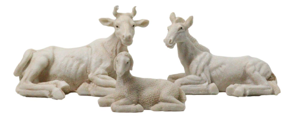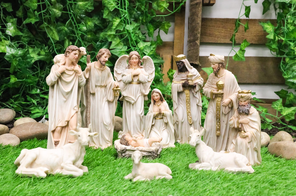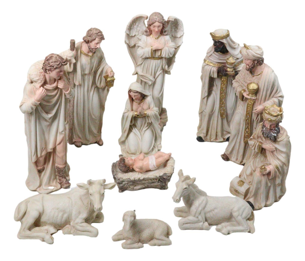 • This Beautiful Nativity Figurines Set measures 2"-8.25" tall, 3.5"-4" long and 2.5" deep approximately. The set weighs about 5 pounds. • This Nativity Sculpture Set is made of designer composite resin, hand painted and polished individually. Color tone may vary slightly from pictures. • Depicting the auspicious nativity of Jesus this set is complete with Joseph, Mary and baby Jesus. This classic nativity set also includes the 3 Wise Men bearing gifts, Shepherd, 3 farm animals and an angel. The sculpture set totals 11 pieces. • Celebrate the true meaning of Christmas with this beautifully crafted Nativity Set featuring Mother Mary, Saint Joseph, Baby Jesus in the manger, the Three Wise Men, angel, shepherd, and beloved stable animals. Each figurine is richly detailed with expressive features and finished in vivid, vibrant colors that bring the sacred scene to life. Expertly sculpted with reverent artistry, this complete set creates a stunning centerpiece for mantels, tabletops, or church displays.