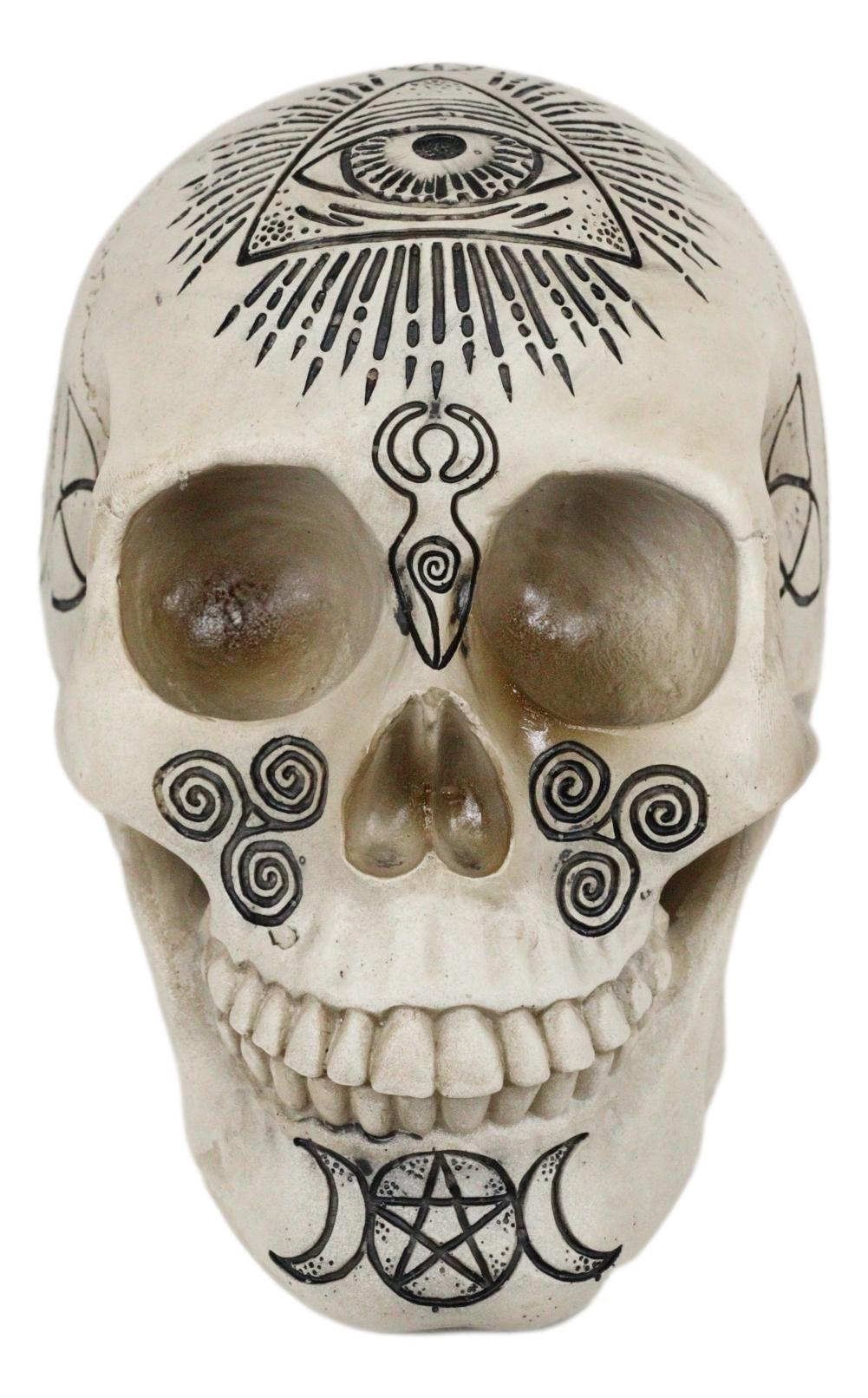 • The Witchcraft Skull is a beautifully detailed decoration for your home or office. The realistic appeal of the skull and witchcraft symbols really show the statement this piece has to bring to any space. Paranormal and Metaphysical symbols are etched on the surface with the likes of the Triskelion, triple moon, spiral goddess, Eye Of Providence, pentagram and many more!