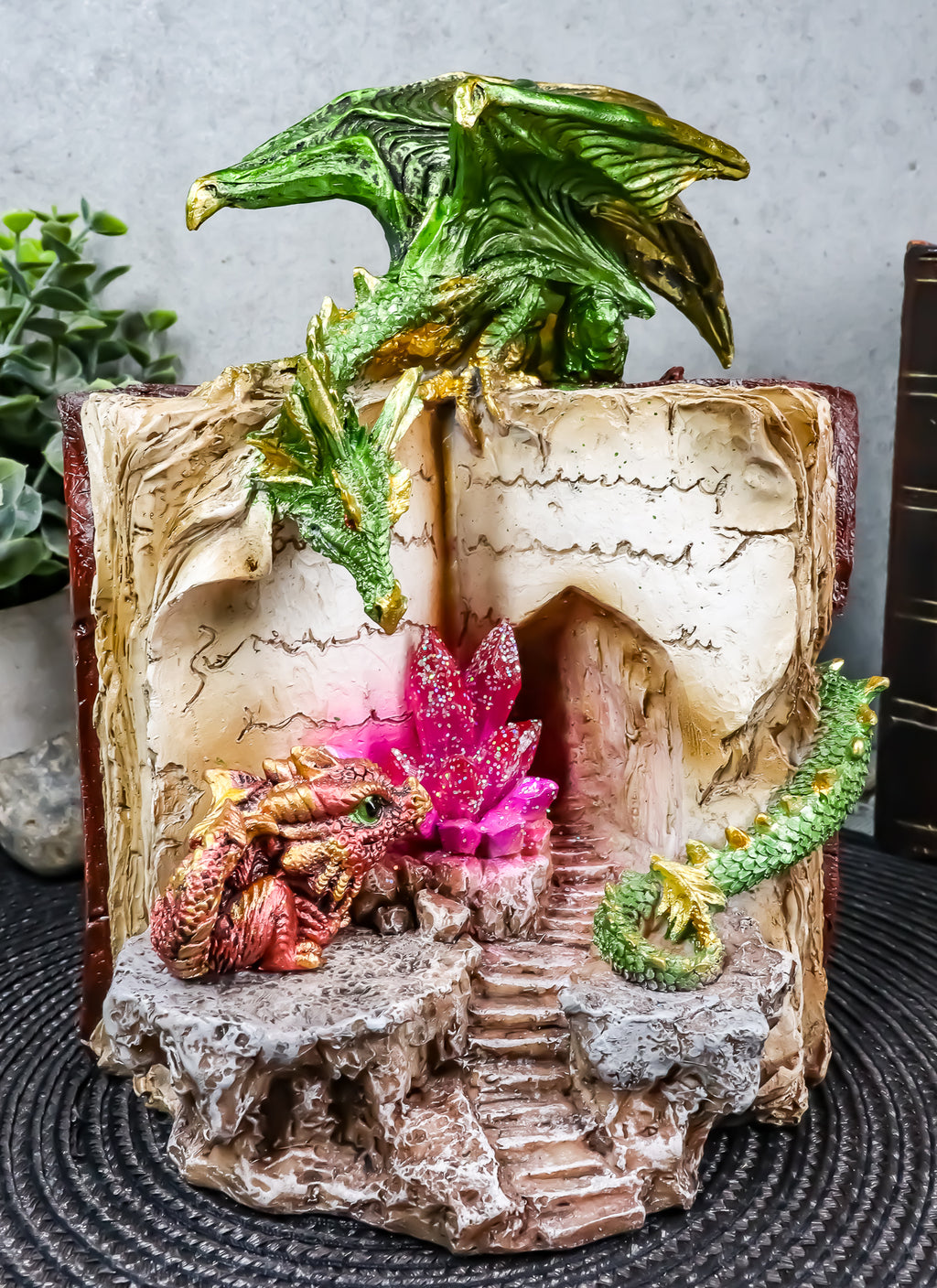 • Light and magic! This stunning piece features a dramatic green mother dragon with a red baby dragon protecting a book of spells. The beast is done in metallic colors of green, red and gold. The book of spells has an enchanted entrance opening into its world of wizardy and right at the entrance is an LED acrylic crystals to light your path. An incredible gift idea for your loved ones who are fans of dragons and all things fantasy!