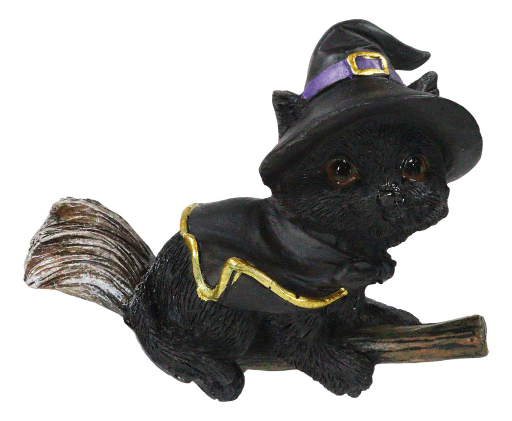 • This Black Cat Riding Broomstick Figurine measures 3.75" tall, 4.25" long and 2" deep approximately. It weighs about 5 ounces. • This Black Cat Figurine is made of polyresin, hand painted and polished individually. • A realistic lifelike black cat kitten is featured in this adorable figurine. The Cat is textured to give a furred look and the painting is sublime with great realism. His glass eyes will look straight into yours and you will almost think he is real! This cat wears a witch hat and cape while riding a magical broomstick. An absolutely gorgeous sculpture for Halloween, lovers of witches, magic and cats! • Props in photos are not included with the item.