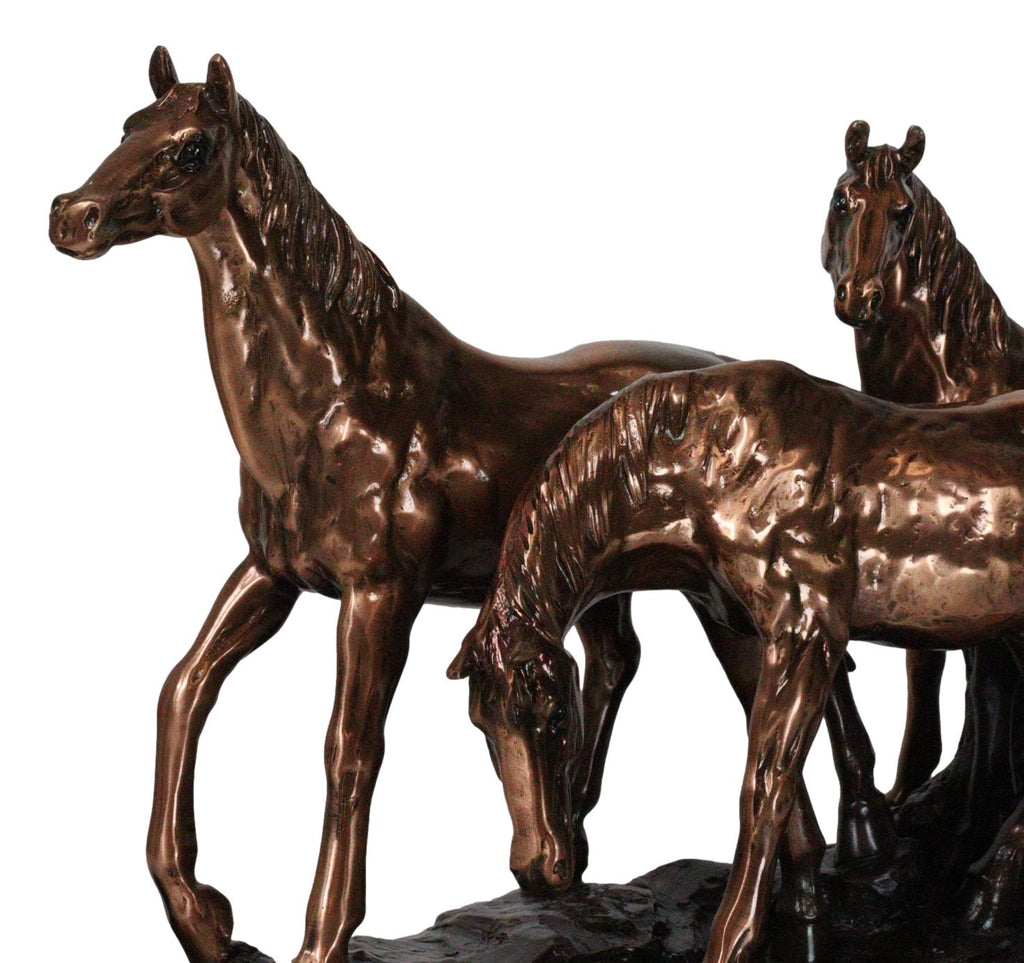 • This Wild And Free Three Horses Statue is made of the highest quality resin, undergoing the process of bronze electroplating giving it a uniform shine on the inside as well as the surface of the figurine. • This Wild And Free Three Horses Statue measures 10" tall (base included), 15.5" long and 6.25" deep approximately. It weighs about 9.75 pounds. • Celebrate the grace and spirit of horses with our stunning "Equine Beauty" figurine featuring three majestic horses in open meadows. Crafted from bronze electroplated resin, this exquisite piece captures the beauty and movement of these magnificent creatures, showcasing intricate details that highlight their flowing manes and powerful forms. The elegant base adds a touch of sophistication, making it a perfect centerpiece for any equestrian lover's collection. • Props in photos are not included with the item. They are meant to provide size perspective of the item.