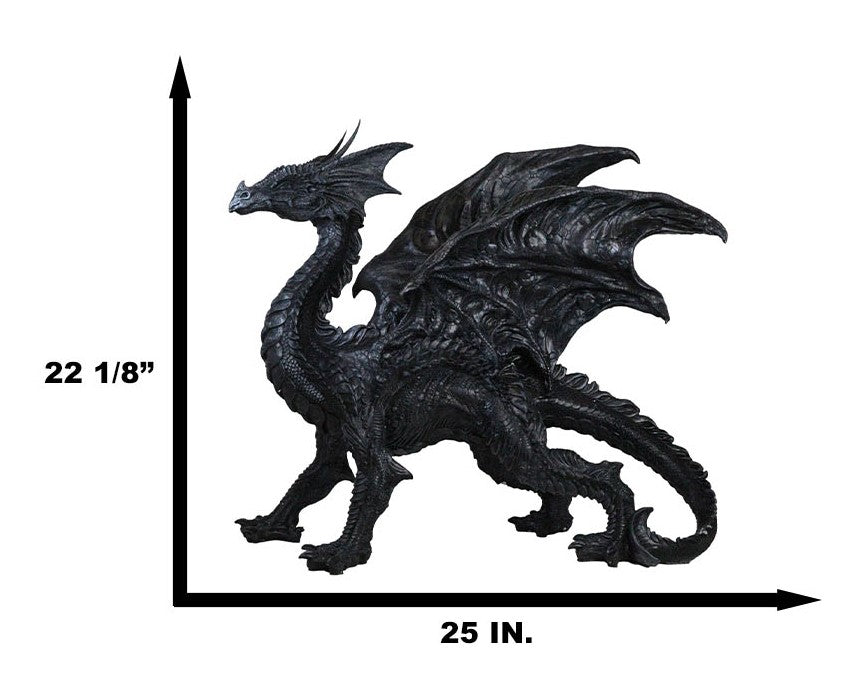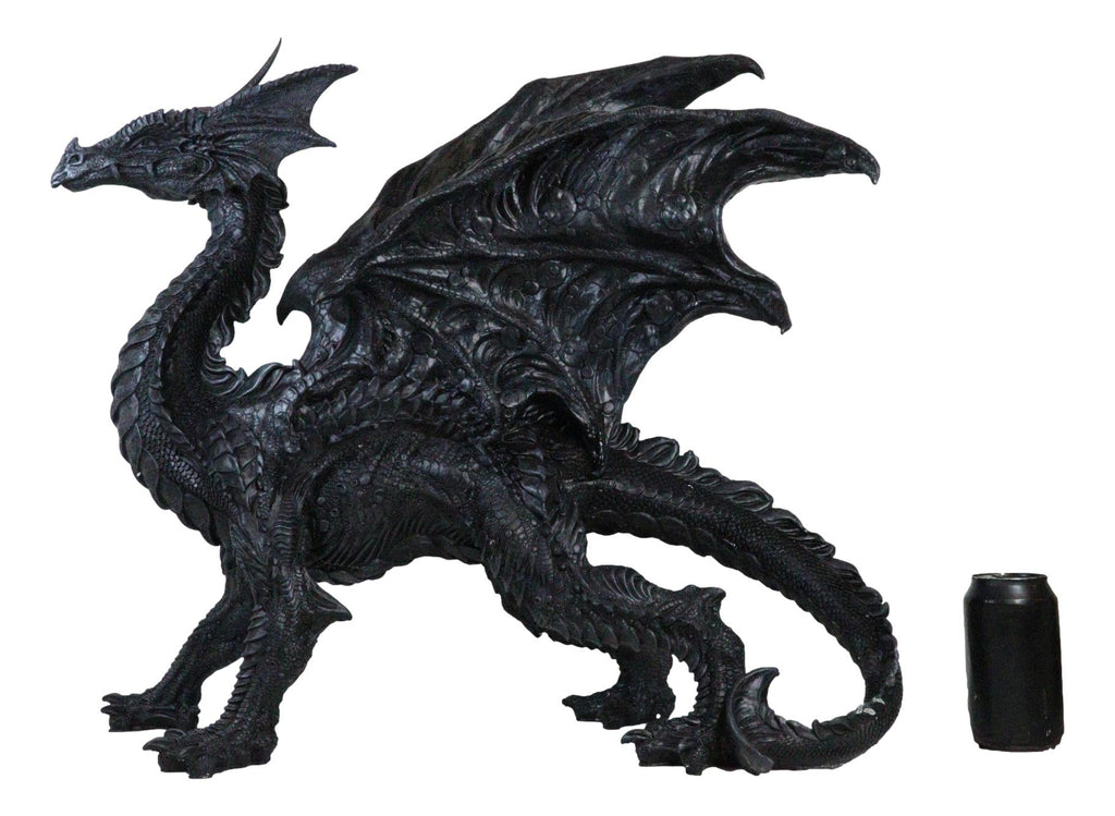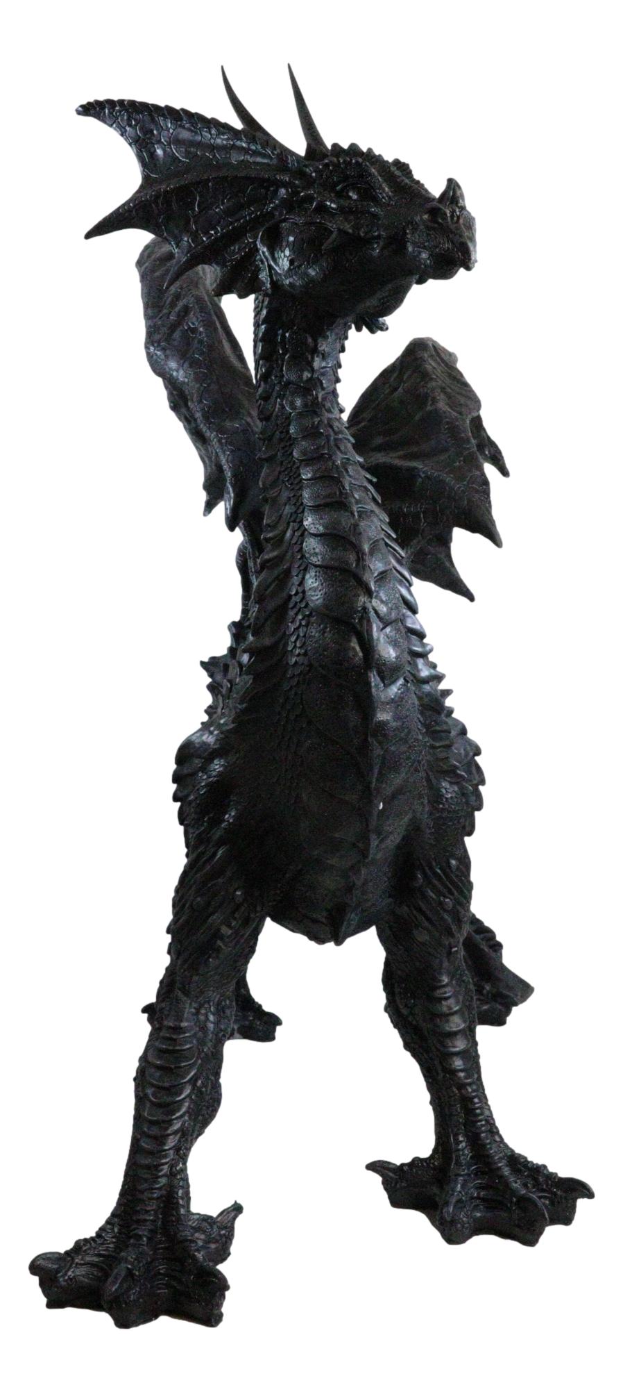 • This Black Dragon Statue measures 22.5" tall, 24" long and 12" deep approximately. It weighs about 13 pounds. • This Black Dragon Statue is made of designer composite resin, hand painted and polished individually. • Embark on an epic journey into the realm of fantasy with our magnificent Black Shadow Dragon Statue. This stunning sculpture depicts a formidable dragon, standing proudly on four legs with its wings perched up, ready to take flight into the night. Crafted with exquisite detail, this Nightfury Black Shadow Dragon exudes an air of mystery and power, with its sleek black scales shimmering in the moonlight. Its piercing eyes and outstretched wings capture the essence of primal strength and beauty.