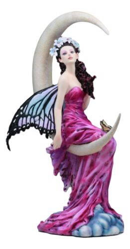 • This Amethyst Moon Butterfly Fairy Statue measures 11.25" tall, 8.25" long and 4.25" deep approximately. • This Amethyst Moon Butterfly Fairy Statue is made of designer composite resin, hand painted and polished. Color Tone may vary • A beautiful Purple Royalyy Robed Fairy Sits atop a lunar amethyst moon, casting a shadow on earth with purple radiance. She wears a beautiful floral laurel over her head and her wings glows in multiple hues of purple similar to a butterfly. This Fairy Masterpiece is the artwork of Nene Thomas. • This is an Ebros Gift And Atlantic Collectibles exclusive collection.
