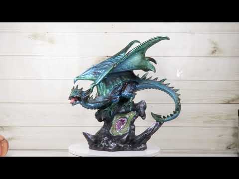 • This Fearsome Dragon On Faux Crystal Geode Rock Figurine measures 15.5" tall, 15.25" wide and 10.5" deep approximately. It weighs about 6.5 pounds. • This Fearsome Dragon On Faux Crystal Geode Rock Figurine is made of high quality designer resin, individually handpainted and polished. Because each piece is partially hand crafted, color tone may vary from pictures. • Enhance your decor with the Iridescent Dragon Figurine, featuring a vibrant LED faux crystal geode rock. This enchanting piece stands 15.25" long and combines a fearsome dragon design with a captivating aquamarine iridescence. The LED-lit faux crystal geode adds a dynamic burst of color and magical glow, making it a striking centerpiece for any fantasy-themed room. Ideal for dragon enthusiasts and those who appreciate a touch of whimsy, this figurine brings both drama and charm to your home.
