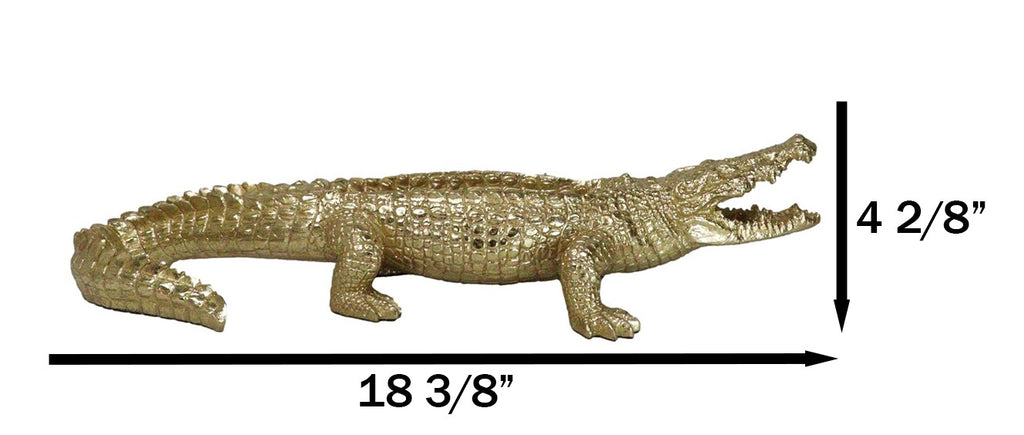 • This Realistic Crocodile Display Tray Sculpture stands at about 4.25" tall, 18.5" long and 6.25" deep. It weighs about 2.5 pounds. • This Realistic Crocodile Display Tray Sculpture is made of designer composite resin, hand painted and polished individually in faux gold patina finish. The crocodile's back has a casement groove to hold potpourris, dry fruits, keys and more. • Add a touch of bold elegance to your decor with our Gold Leaf Ferocious Crocodile Tray Sculpture. This striking piece features a lifelike crocodile with jaws wide open, showcasing its razor-sharp teeth, all crafted in a luxurious faux gold leaf finish. Perfect for making a statement, this unique sculpture functions as both a decorative tray holder and an eye-catching centerpiece. Ideal for adding a dramatic flair to any room, it seamlessly blends functionality with artistic design. • Props in photos are not included with the item.