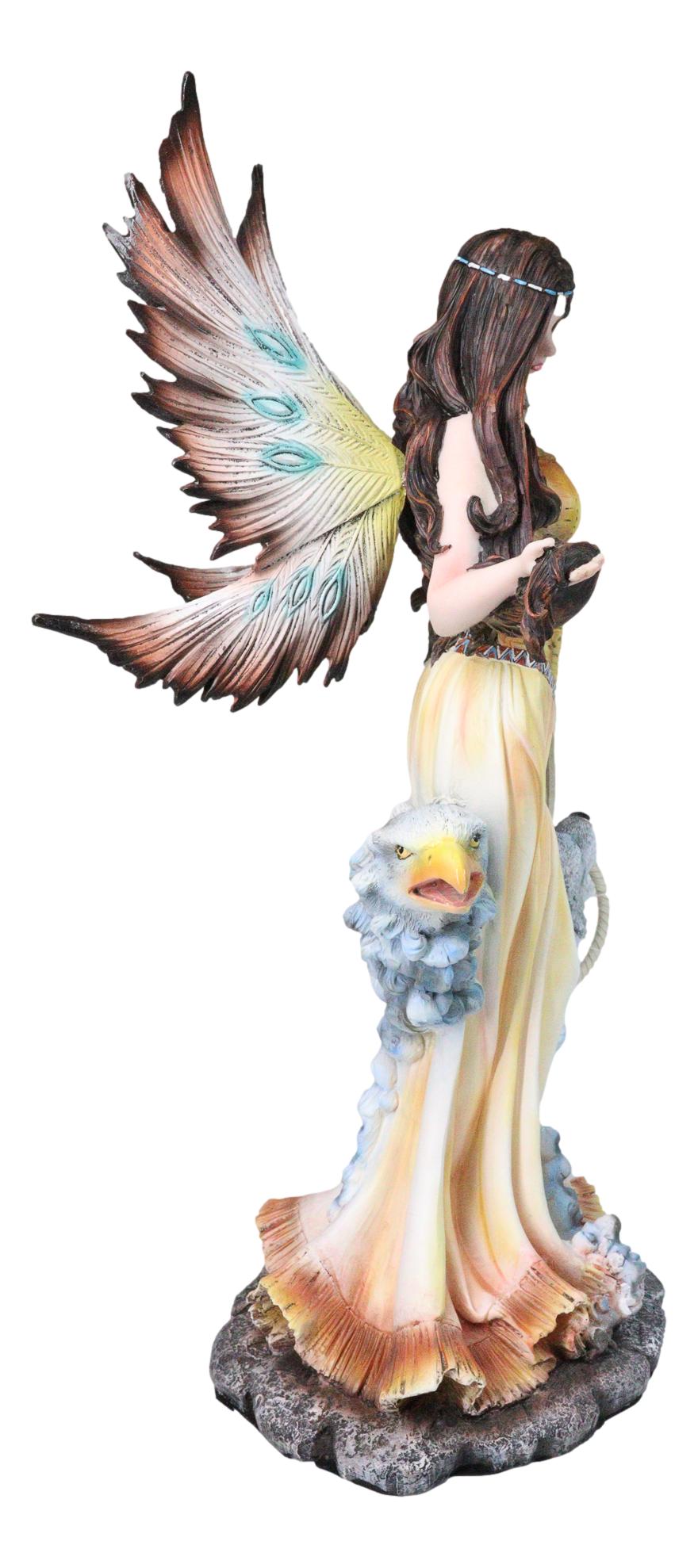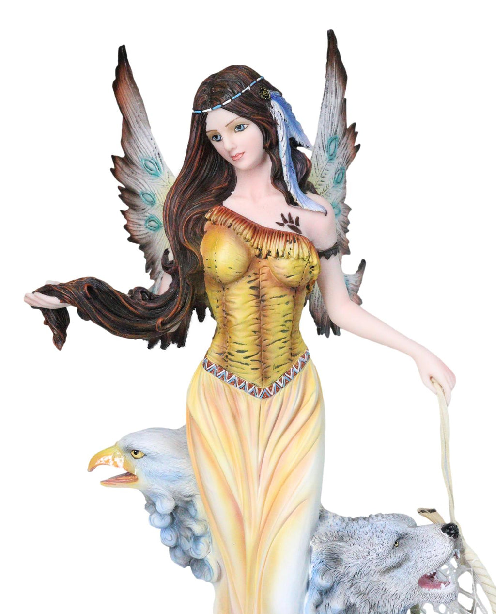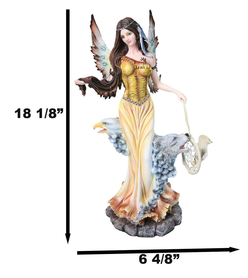 • This tribal indian fairy with wolf and eagle figurine measures 18.25" tall, 9.25" wide and 6.5" deep approximately. It weighs about 3.5 pounds. • This tribal indian fairy with wolf and eagle figurine is made of designer composite resin, hand painted and polished individually. • Elevate your décor with the Native American Fairy Dreamcatcher Figurine, standing an impressive 18" high. This striking piece features a powerful fairy with detailed wings, holding a dreamcatcher, accented with sculpted clouds, an eagle, and a wolf-symbols of strength, guidance, and intuition. Rich textures and bold artistry bring every element to life, making it a captivating centerpiece for fantasy collectors and lovers of majestic, nature-inspired décor. • Props in photos are not included with the item. They are meant to provide size perspective of the item(s).