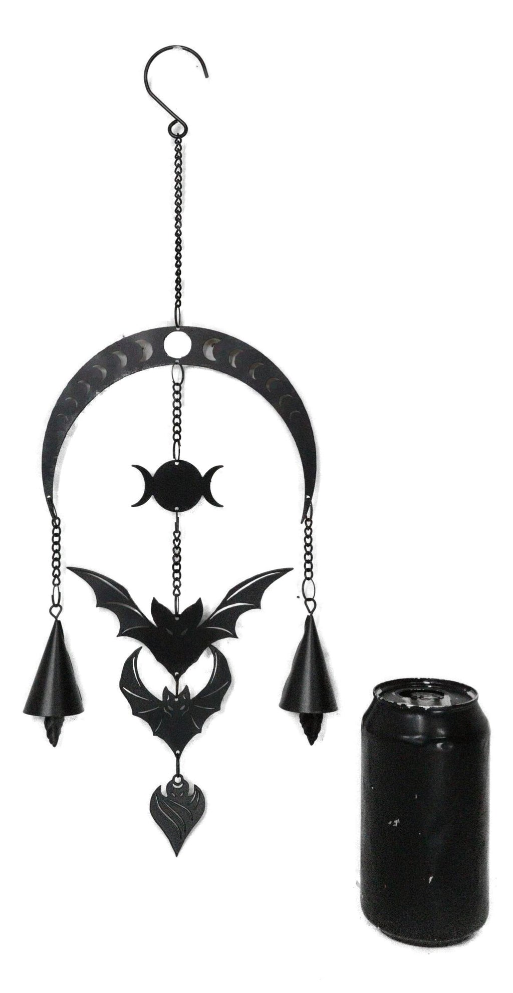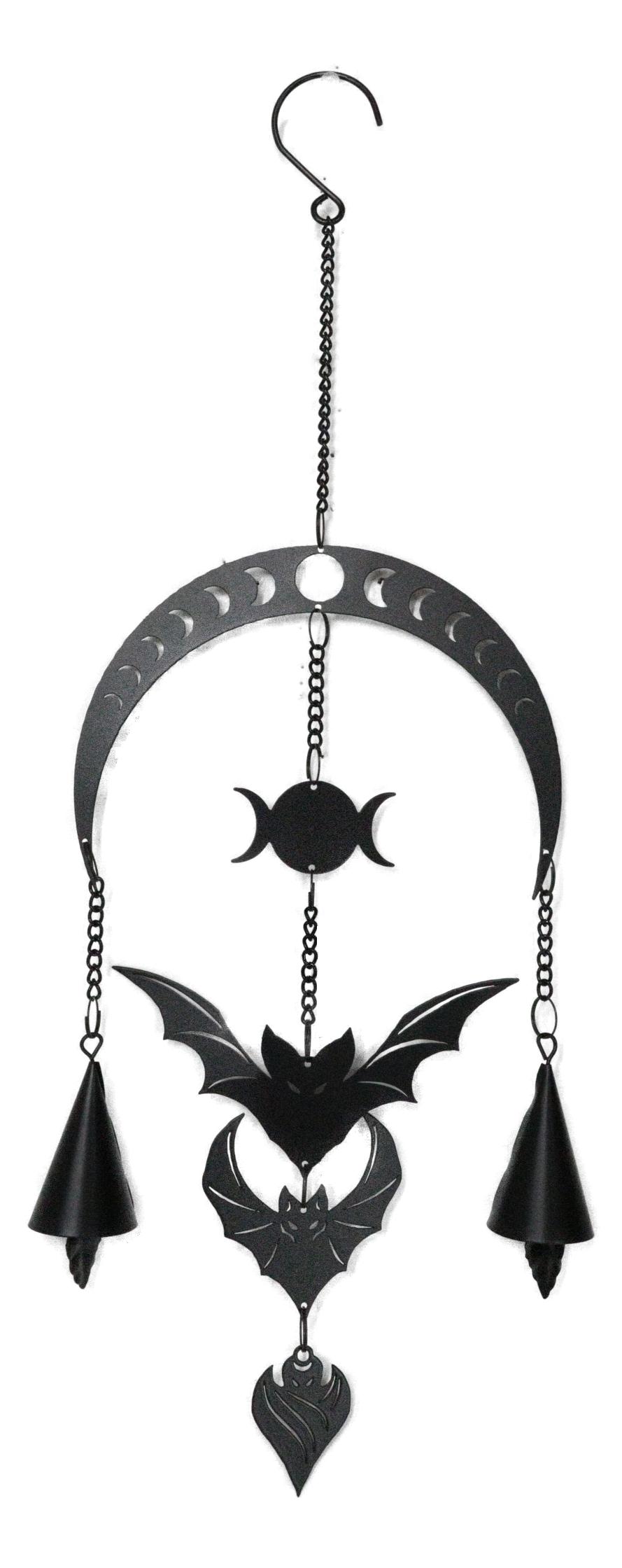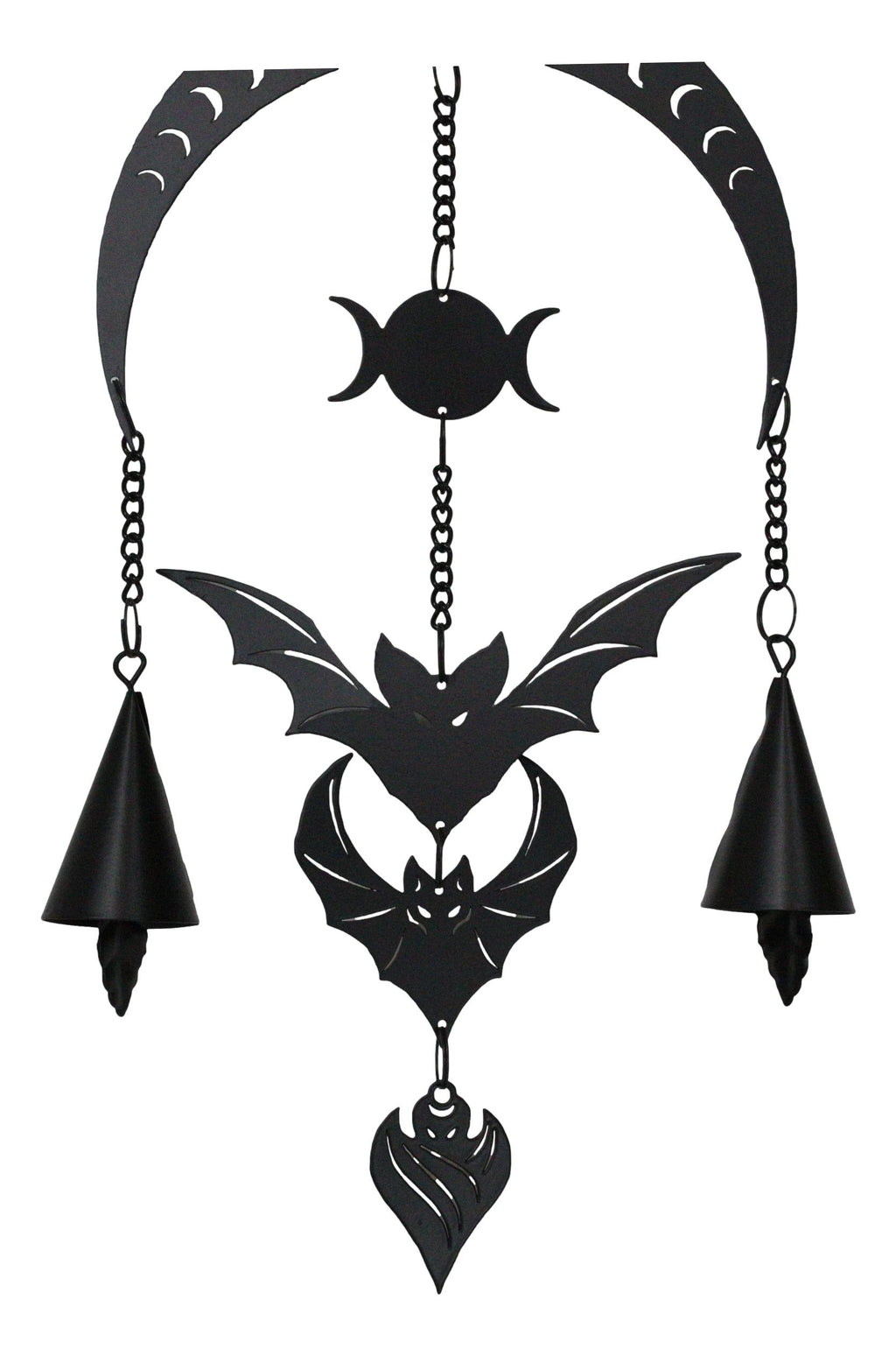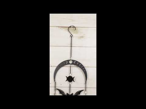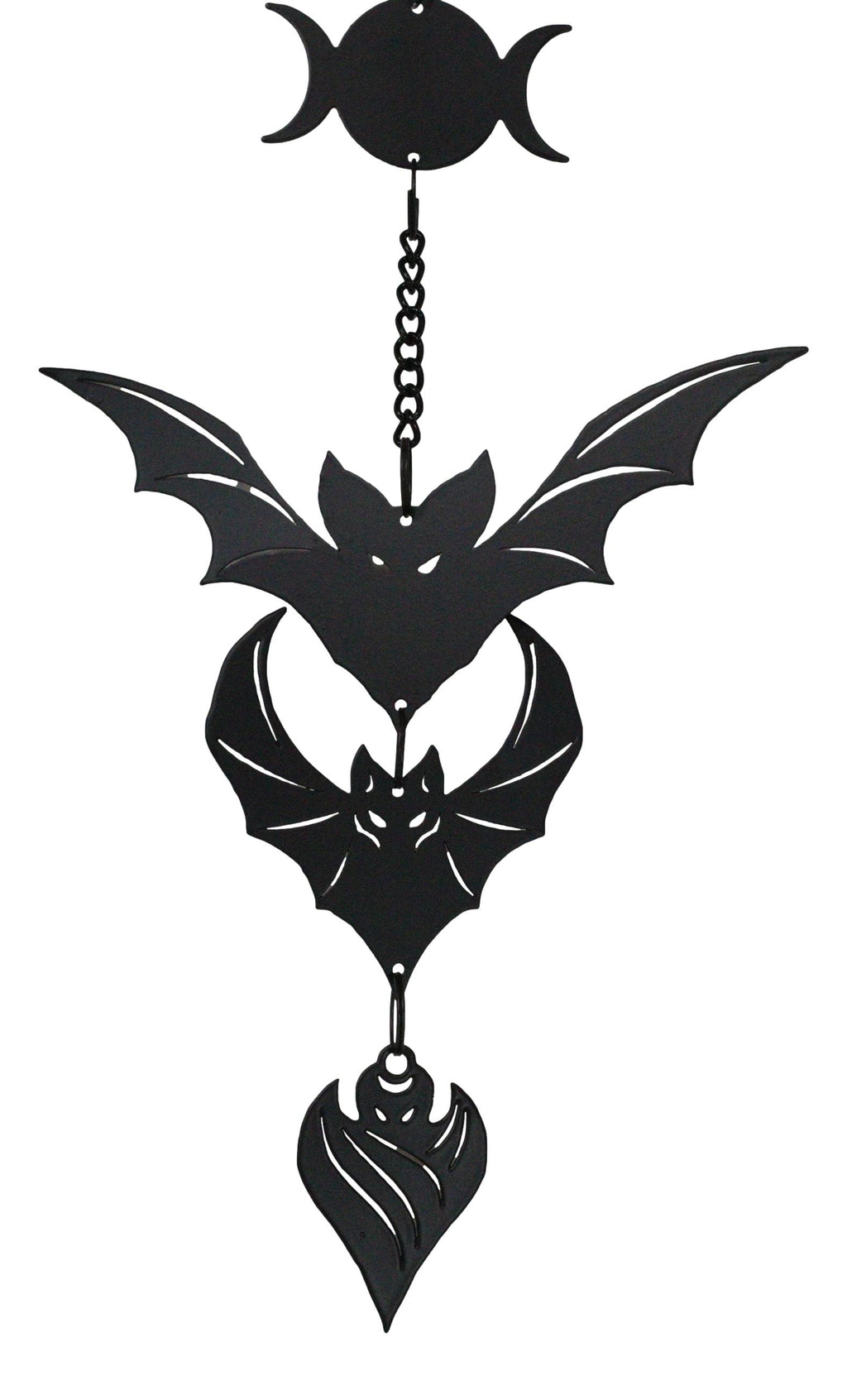 • This Hanging Decoration is approximately 18" Tall from the base of the bat to the top of the hook. The Moon Phase at the crown is 7" Wide. • This Hanging Decoration is made of steel metal, powder coated in black. • Add a touch of eerie elegance to your decor with this Flying Bats with Phases of the Moon Wall Hanging Decoration. Expertly crafted from black-coated steel, this dramatic piece features a captivating scene of flying bats silhouetted against the phases of the moon. The intricate design evokes a sense of dark mystery and gothic allure, making it a perfect addition to any space seeking a touch of the macabre.