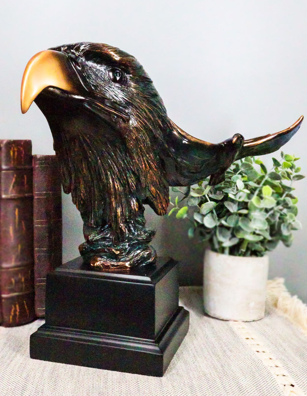 • This Impressive Bald Eagle Bust Sculpture is made of the highest quality resin, undergoing the process of bronze electroplating giving it a uniform shine on the inside as well as the surface of the figurine. To add sculptural aesthetics and display worthiness, we add accent faux black wooden base to the sculpture.