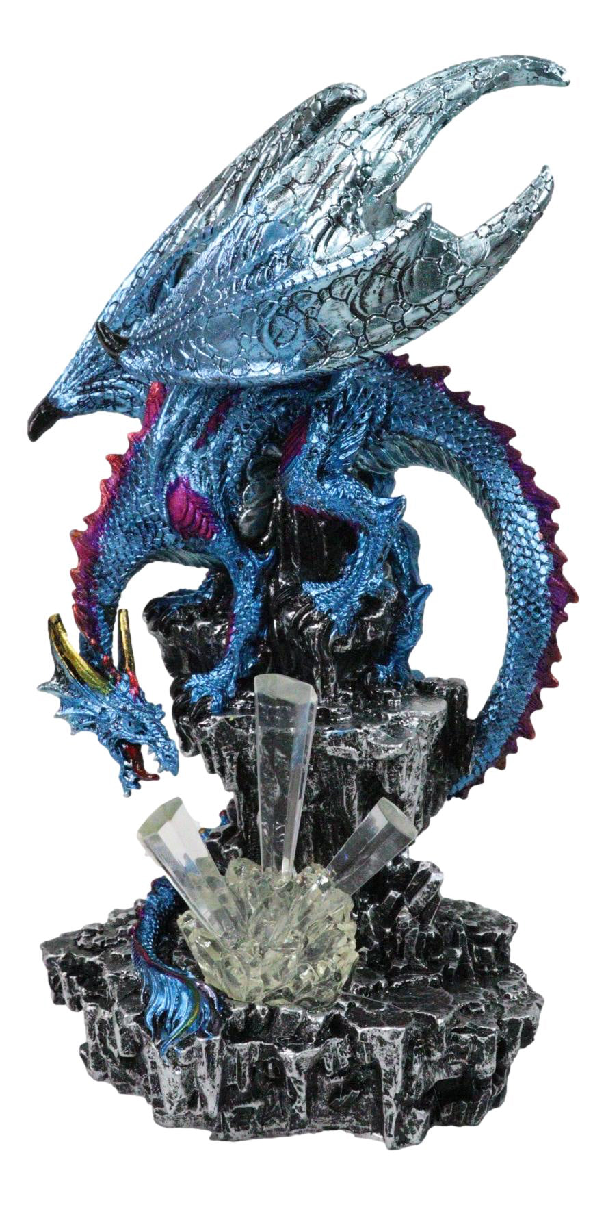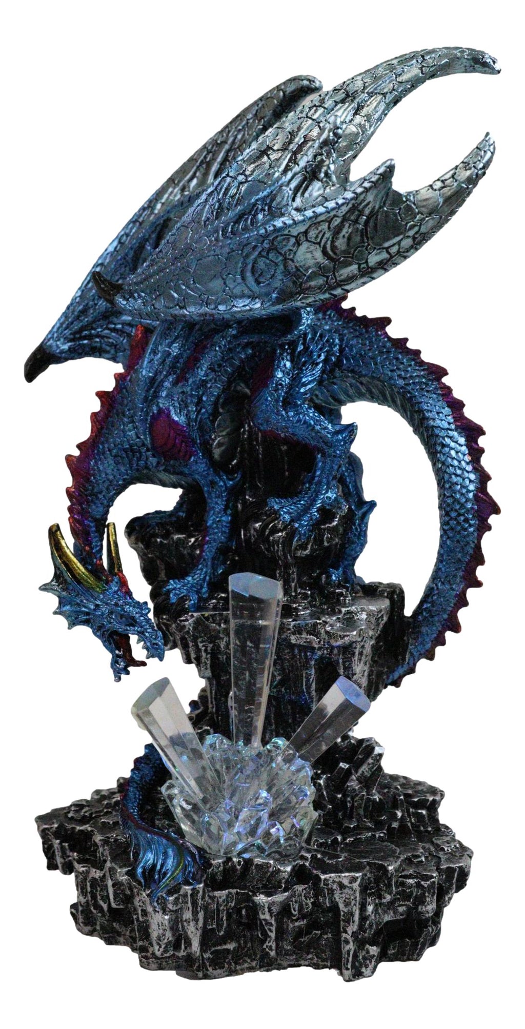 • This Blue Dragon Figurine is approximately 12" tall and 7" long and 5.75" deep (inches). It weighs about 2.75 pounds. • This Blue Dragon Figurine is made of designer composite resin, hand painted and polished individually. • This is a gorgeous and stunning piece of art. Our sculptors and painters have done an excellent job in creating great details to the dragon. Display this centerpiece in your home or garden and watch it gain admiration from all eyes that see him. • Illuminate your space with the Blue Dragon Guarding Crystals Figurine. This captivating piece features a fierce dragon in shimmering blue hues with vivid magenta spikes, protectively encircling glowing ice-like crystal formations powered by LED light. Radiant and dramatic, it brings a touch of fantasy and power to any room. Perfect for dragon collectors, fantasy décor lovers, or as a dazzling statement piece that captures mythical elegance and strength.