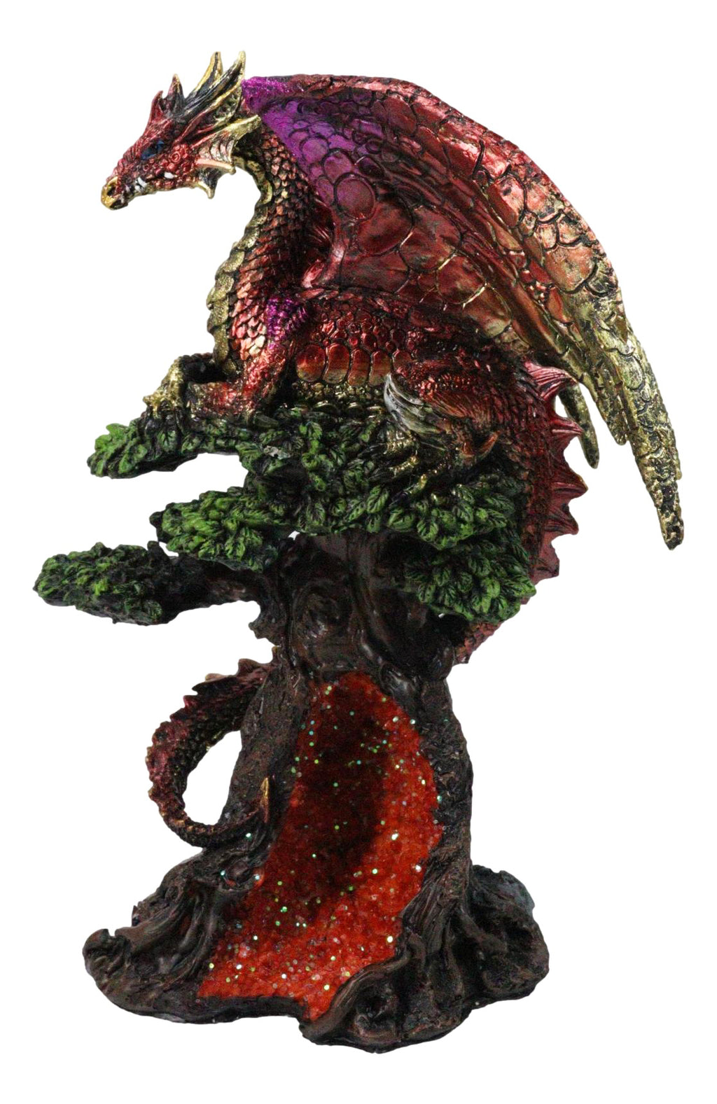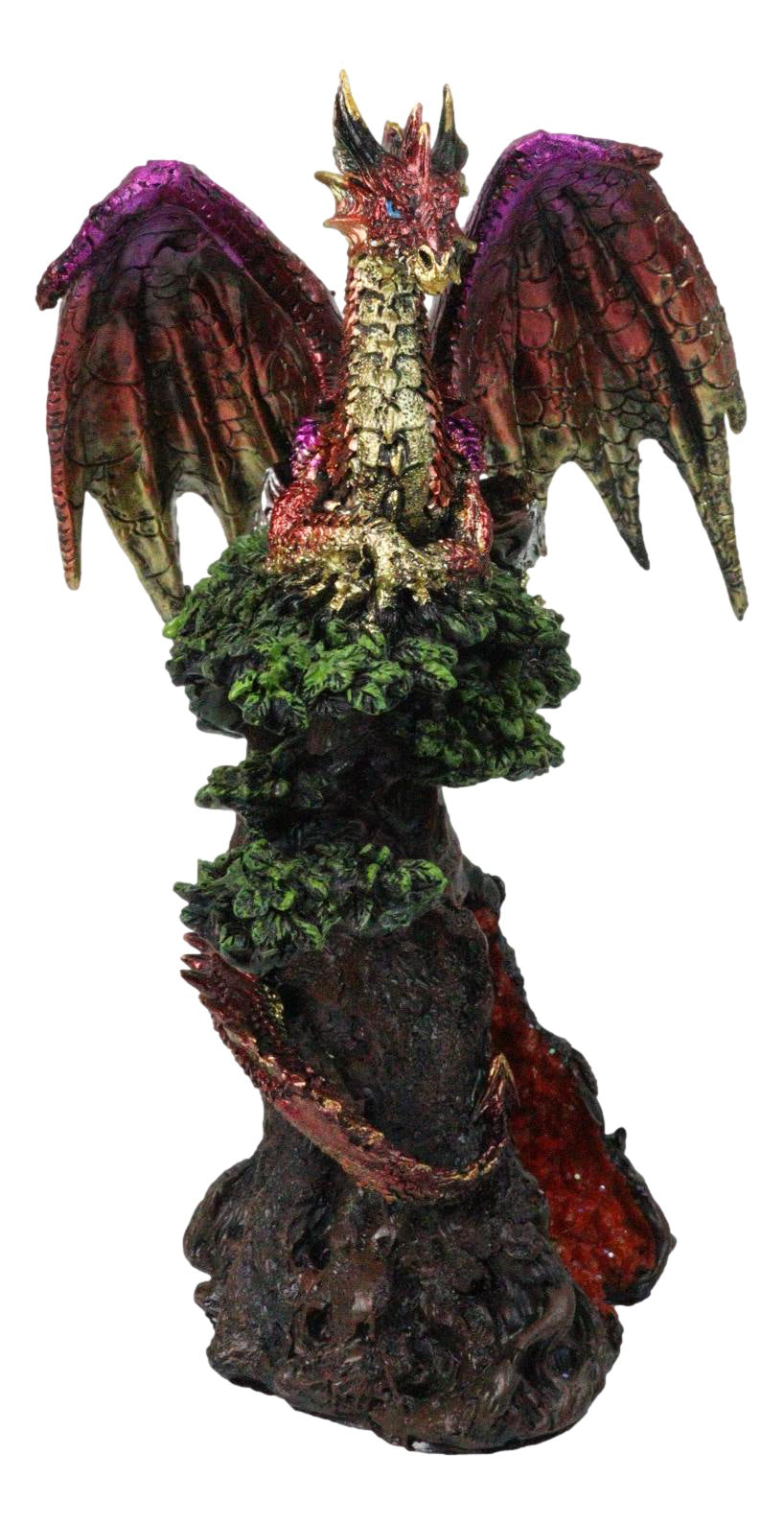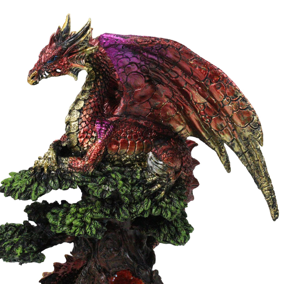 • This Red Dragon Figurine is approximately 9.75" tall and 7" long and 6.25" deep (inches). It weighs about 2 pounds. • This Red Dragon Figurine is made of designer composite resin, hand painted and polished individually. • This is a gorgeous and stunning piece of art. Our sculptors and painters have done an excellent job in creating great details to the dragon. Display this centerpiece in your home or garden and watch it gain admiration from all eyes that see him. • Bring fiery elegance to your collection with the Metallic Iridescent Dragon Perching on Tree Canopy Figurine. This breathtaking piece features a majestic dragon in radiant red and gold tones, resting atop a sculpted tree canopy that reveals a shimmering faux quartz geode at its heart. Rich in color and intricate detail, it captures the essence of power, mystery, and fantasy. Perfect for dragon enthusiasts, collectors, or as a striking statement piece in any décor.