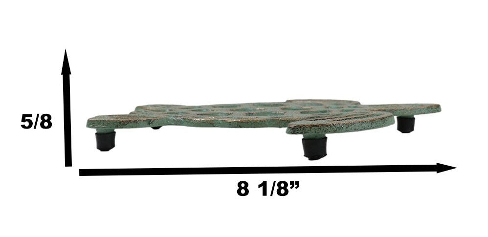 • This cast iron sea turtle trivet is a refreshing, functional way to keep your dining table or counters from getting heat damaged when hot pots are placed on them. It is equipped with rubberized feet on the bottoms to prevent scratches on your furniture. It can also be hung on a wall or placed on a shelf when not in use, as a decorative accent.