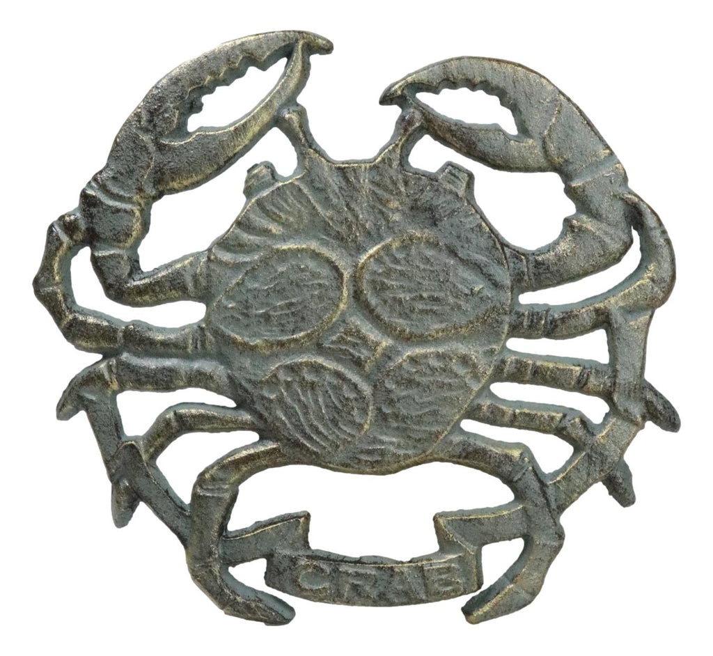 • This Sea Crab Table Trivet Sculpture is 7.5" Long, 7" Wide and 0.75" thick approximately. It weighs about 1.5 pounds. • This Sea Crab Table Trivet Sculpture is made of cast iron, individually hand crafted, painted and polished. Color Tone may vary slightly from pictures. • This cast iron trivet is sure to become an everyday staple of your home kitchen and dining décor. Cast iron is one of the best materials to use in your kitchen. Its ability to retain heat and its sturdiness means that this trivet is perfect for use in the harshest kitchens and is sure to stand the test of time. The trivet feet is equipped with rubber stoppers. The trivet can also be mounted on walls as a decor piece. • Soda can placed next to the sculpture is not included with the listing. It is meant to provide size perspective of the item.