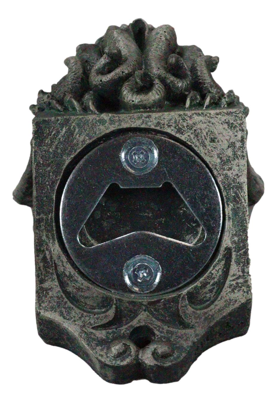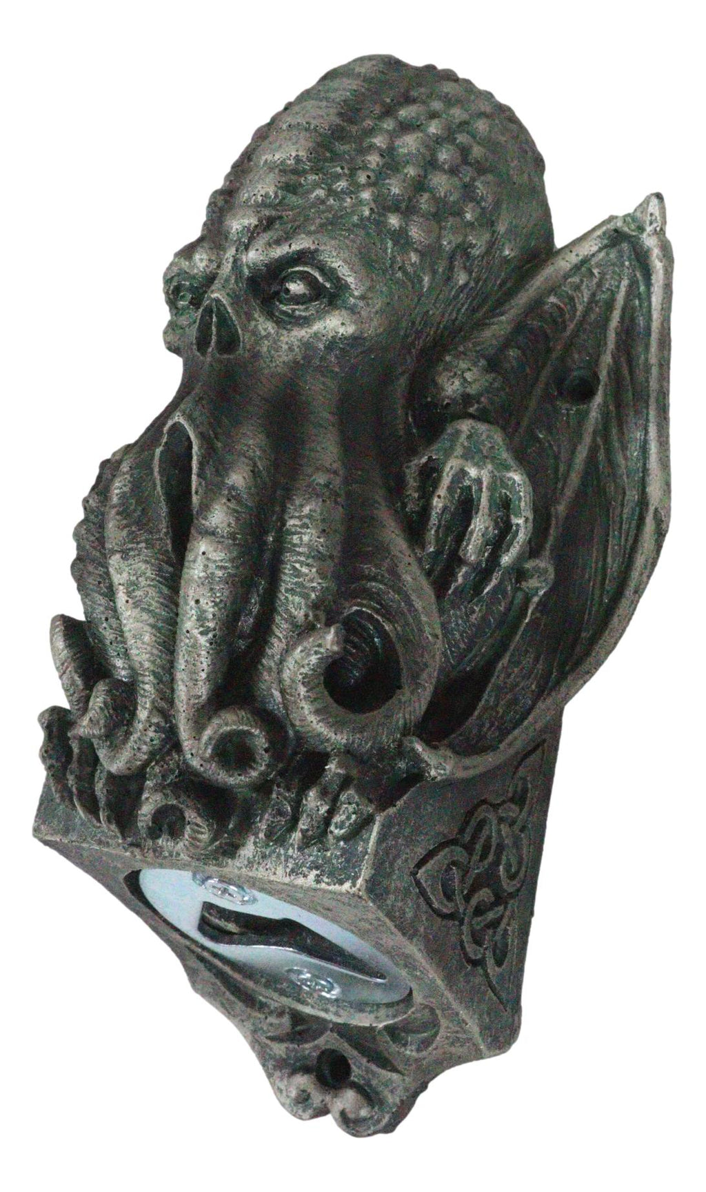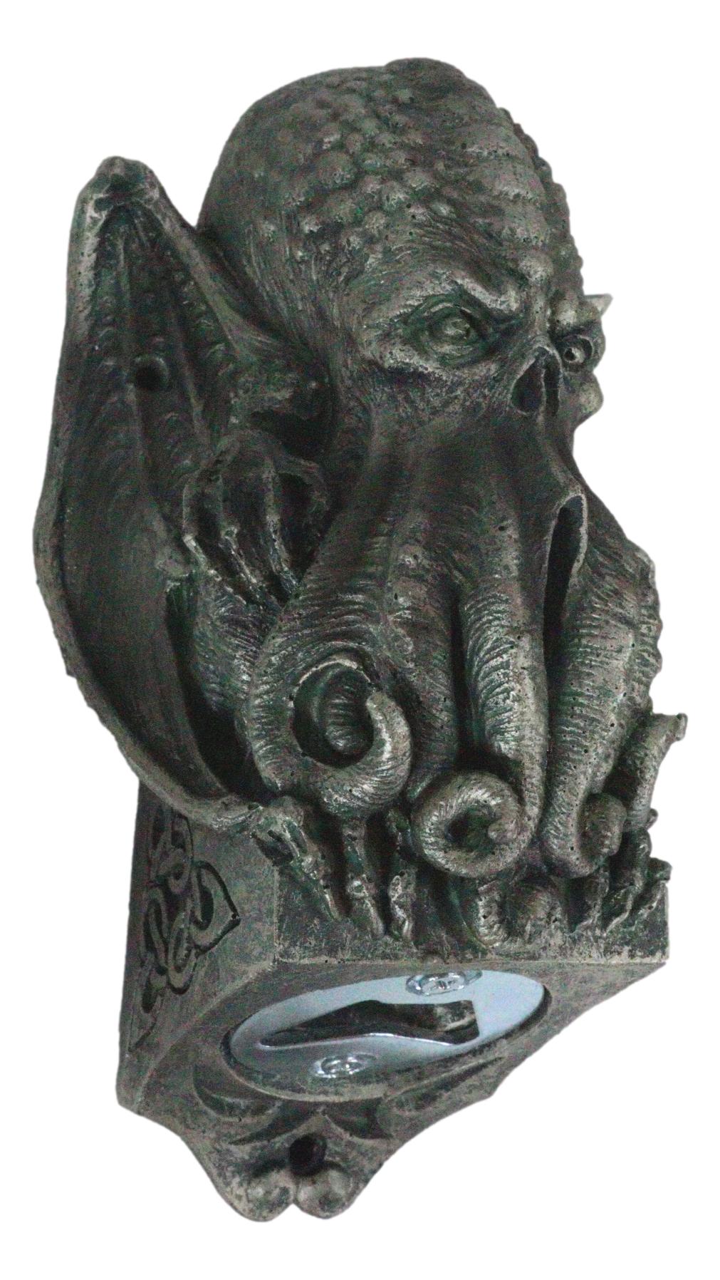 • This High Priest Elder Winged Cthulhu Sculpture is made of polyresin and stainless steel, hand painted and polished individually. • This High Priest Elder Winged Cthulhu Sculpture measures 6.75"High, 3.5"Wide and 3.25"Deep approximately. It weighs about 13 ounces. • Cthulhu is a monstrous entity who lies "dead but dreaming" in the city of R'lyeh, a place of non-Euclidean madness presently (and mercifully) sunken below the depths of the Pacific Ocean. Cthulhu appears in various monstrous and demonic forms in early myths of the human race. Racial memory preserves Him as humanity's most basic nightmare. Cthulhu is the high priest of the Great Old Ones, alien beings who ruled the Earth before humanity formed, worshipped as gods by some misguided people. • Now you can add mysticism onto your walls where booze is constantly flowing... Cthulhu is perching on a rock which holds the hardware to open your beer bottles. Predrilled holes on the sculpture makes for easy installation. Make sure you anchor your sheet rock drywalls before hanging it. • Props in photos are not included with the item.