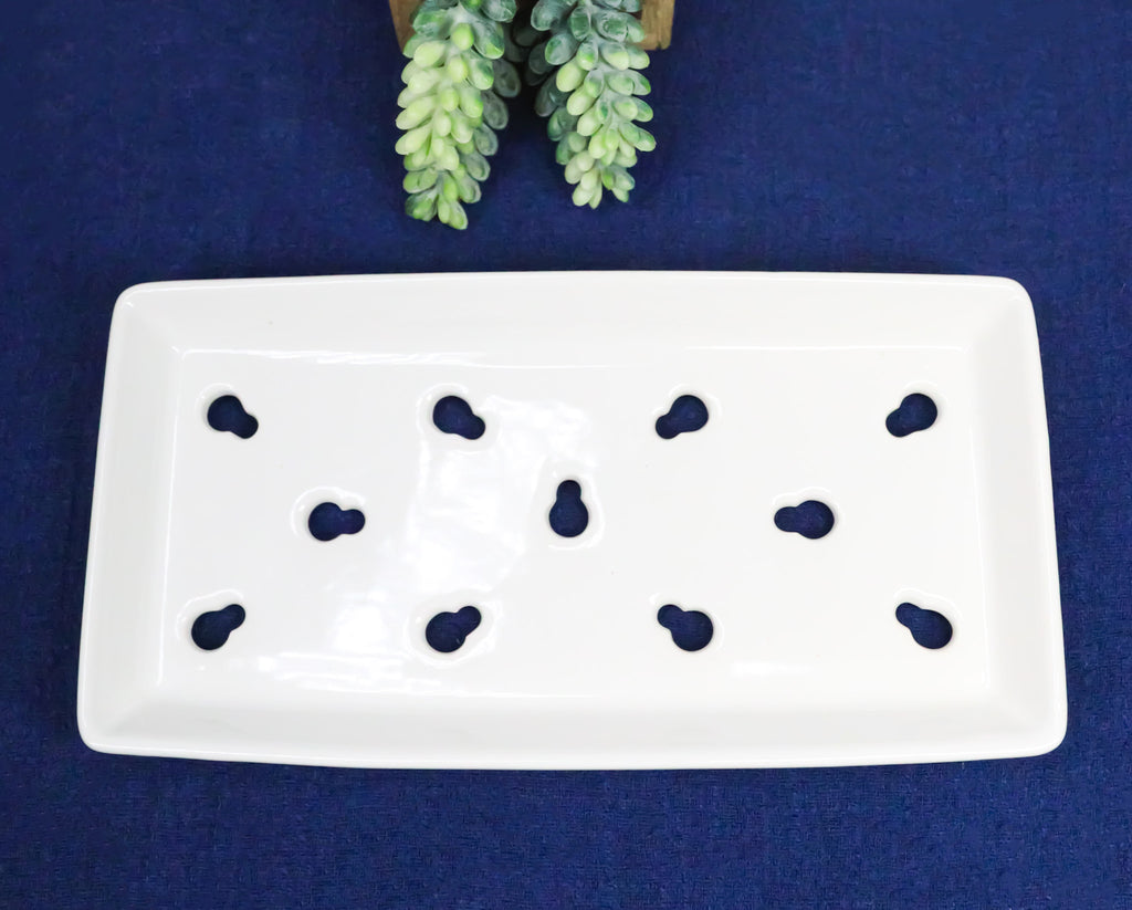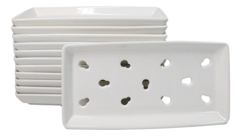 • This Contemporary Neta Zara Sushi Sashimi Plates Set is made of high quality porcelain. Our traditionally crafted porcelains are made of the highest quality porcelain available and fired at a high temperature to maximize the strength of the porcelain, making them superior to other ceramics in the market. Our porcelains are more resistant to cracks, stains, and scratches. Our porcelain is food safe and contain no lead or cadmium. • Neta Zara plates are essential building blocks for an attractive and functional sushi case. The holes on the bottom allow excess liquid to drain, keeping fish and seafood fresh longer. These Neta Zara plates are a staple must haves for any Sushi Chef for food safety preparations. • These Porcelain Neta Zara plates set each measures 8.25" Long, 4.25" Wide and 1" High. Each plate weighs about 11 ounces. • This listing is for a pack of 12 White Neta Zara Plates.