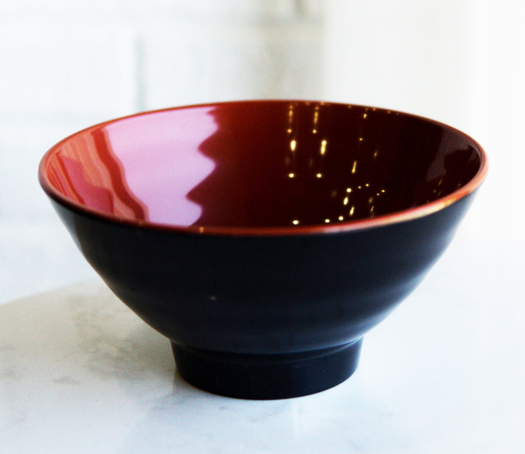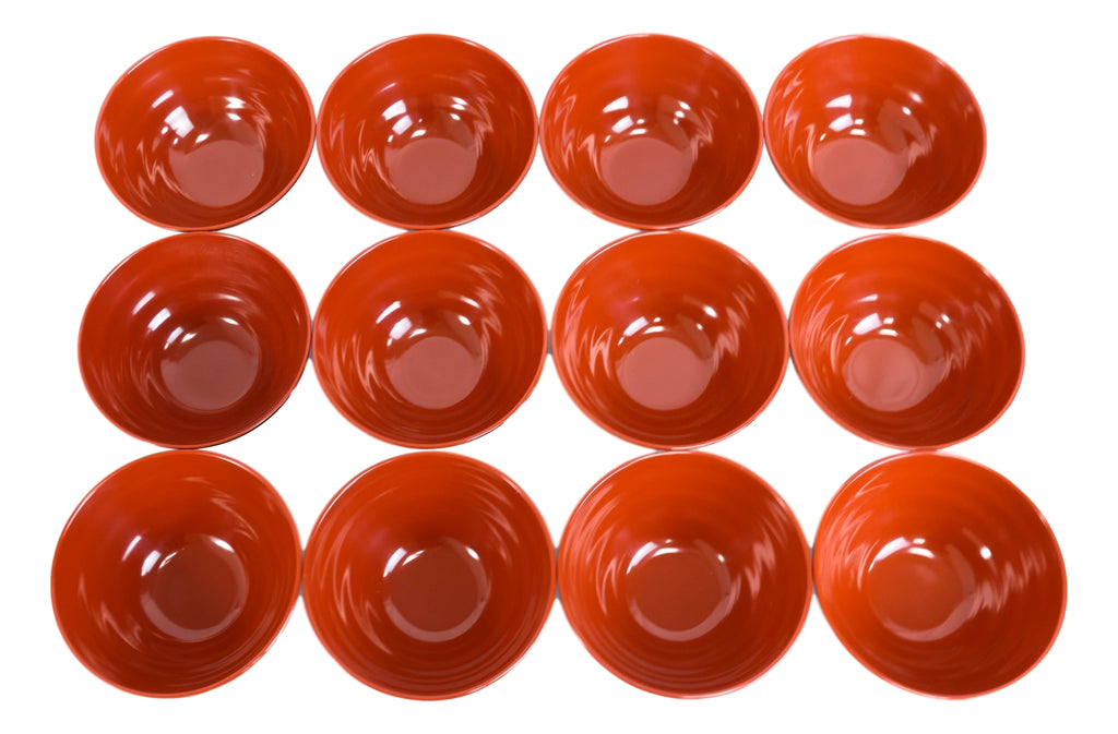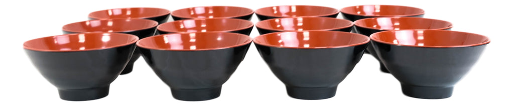• These Small Melamine Bowls Set each measures 4.75"Diameter 2.5"High. Each Bowl holds a 10oz fluid capacity. • These Small Melamine Bowls are made of high quality melamine in a state of the art factory in China. Because they are made of melamine, these bowls are perfect for high-volume restaurants and private parties due to its shatter- and stain-resistant properties. Therefore, these bowls will sustain long-term use while maintaining its red and black color and overall quality. • These restaurant grade melamine bowls are dishwasher safe but they are not microwave safe (melamine products should never be microwaved). • They are the perfect size for rice, appetizer miso, wonton, appetizer or dessert soups. The ridged outer surface of the bowls are not only aesthetically pleasing but also ergonomically designed for better grip and comfort. The bowls are stackable too for better kitchen organization (see one of our photos). • This listing is for a pack of 12.