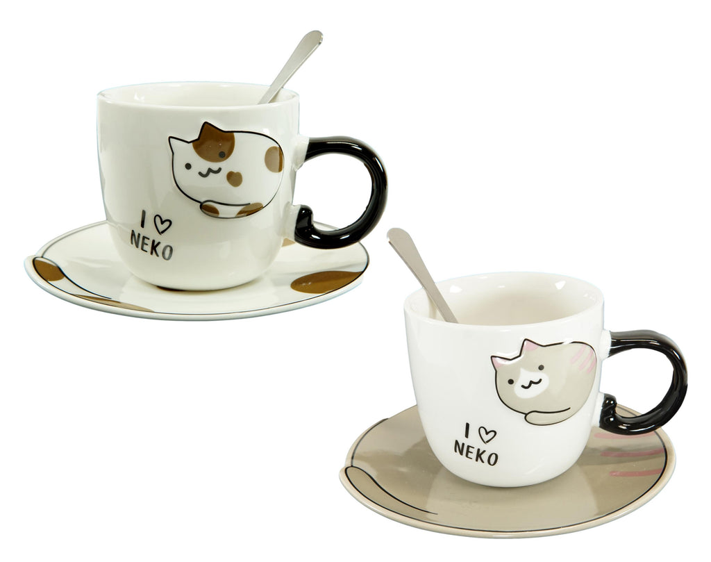 • Each Of These Adorable Cat Mugs And Saucers Set is made of high quality ceramic porcelain. CA Prop 65 Compliant, our porcelain is food safe and contains no lead or cadmium. This Adorable Cat Mug is double walled for higher durability and ease of cleaning. • Each Cat Mug is 3" tall, 4" long and 2.5" in diameter. Mug has 8oz capacity. The spoon is 4.75" long. The saucer is 5" in diameter. Microwave and Dishwasher safe (EXCEPT for the metal spoon). • Adorably packaged in a gift ready box, this drinkware set comes with a mug, saucer and a notched spoon in matching design. Every mug has the words I Love(Heart) Neko, designed in anime cartoon style. Readily enjoyed by both kids and adults, this mug set is versatile in purpose and giftable to all cat lovers of all ages. • This listing is sold as a pack of 2 mugs and saucers set. You will get 1 Calico Mug/Saucer/Spoon Set and 1 Brown Mug/Saucer/Spoon Set • Food And Props in photos are not included with the item.