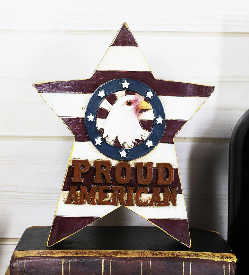 • Upheld for generations as the image of freedom, the American Bald Eagle And the Liberty Bell comes to life in these impressive American Stars Desktop Plaques. Starting with a background shaped as red and white striped stars, the center of the sculptures showcases the Liberty Bell on one and the Majestic Eagle on the other. Add style and patriotism to your office, living room, study room or what have you with this Patriotic Stars!