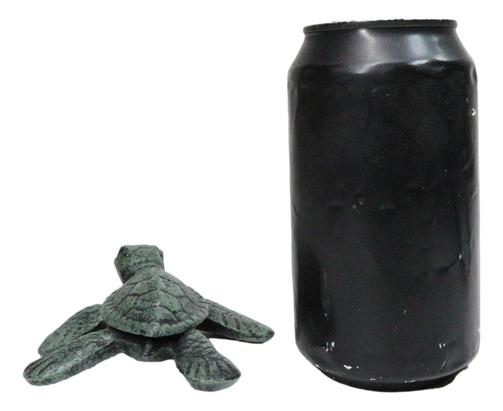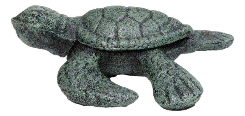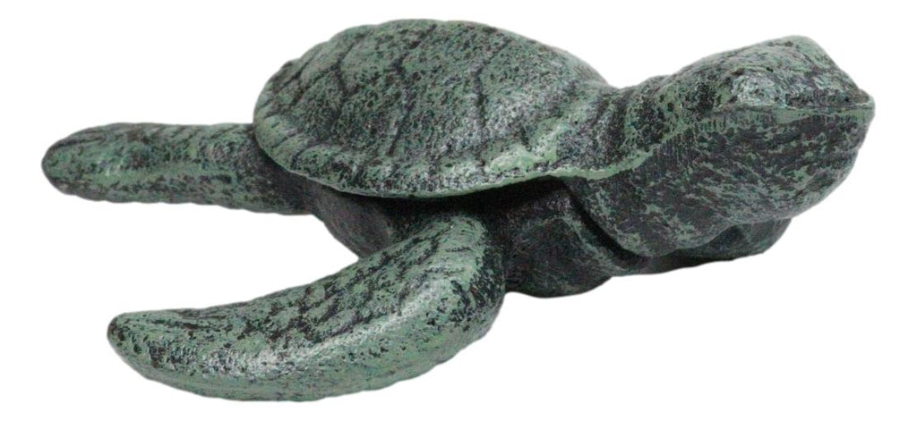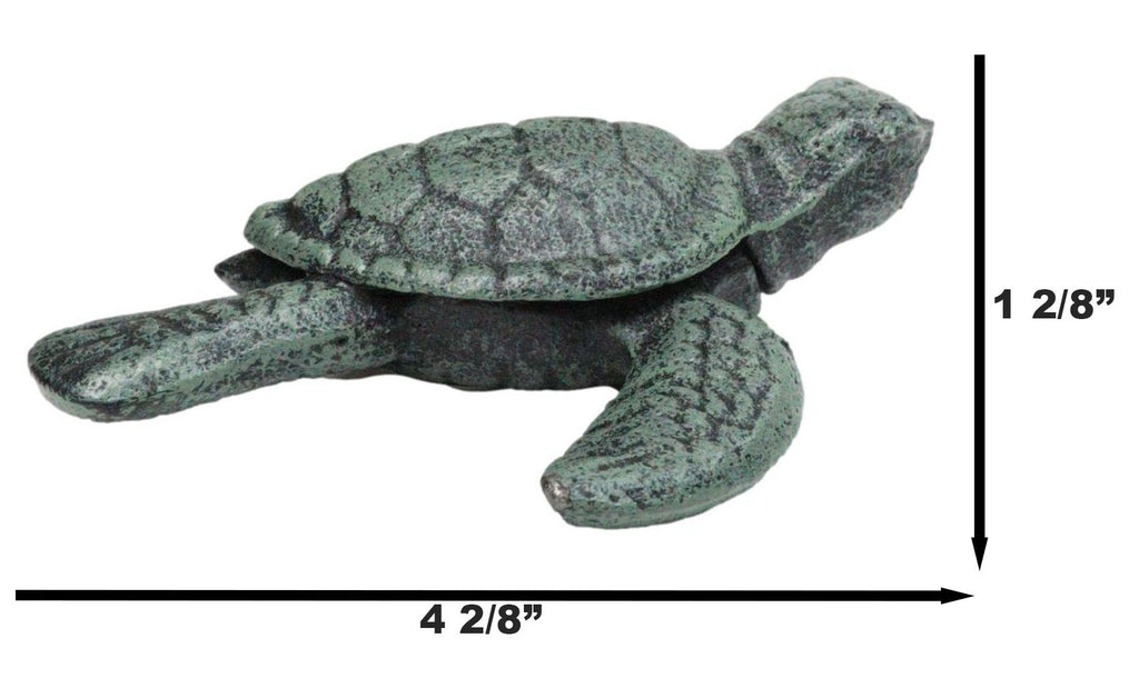 • This Adorable Sea Turtle Figurine is 1.25" tall, 4.25" long and 4" deep approximately. The sculpture weighs about 11 ounces each. • This Adorable Sea Turtle Figurine is made of cast iron, hand painted and polished individually. Being made from high-quality cast iron, it not only exudes durability but also adds a rustic and timeless appeal to your decor. • Bring a touch of ocean tranquility to your space with this Cast Iron Green Verdigris Sea Turtle Decorative Mini Figurine. Crafted from durable cast iron with an aged verdigris finish, this charming sea turtle captures the beauty of marine life in a timeless rustic style. Perfect for beach houses, coastal décor, or as a small accent on desks and shelves, it adds a peaceful seaside vibe to any setting. • Props in photos are not included with the item. This listing is for 4 sea turtles.