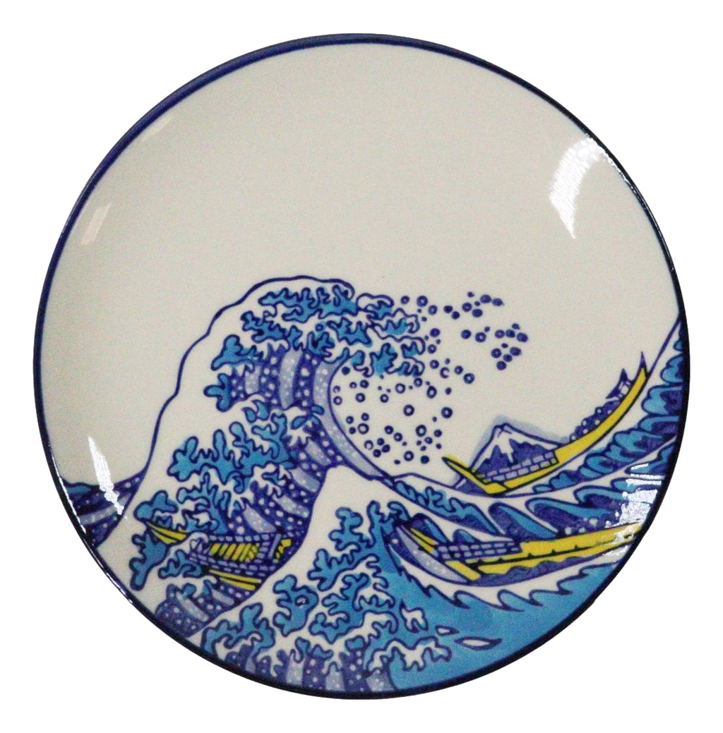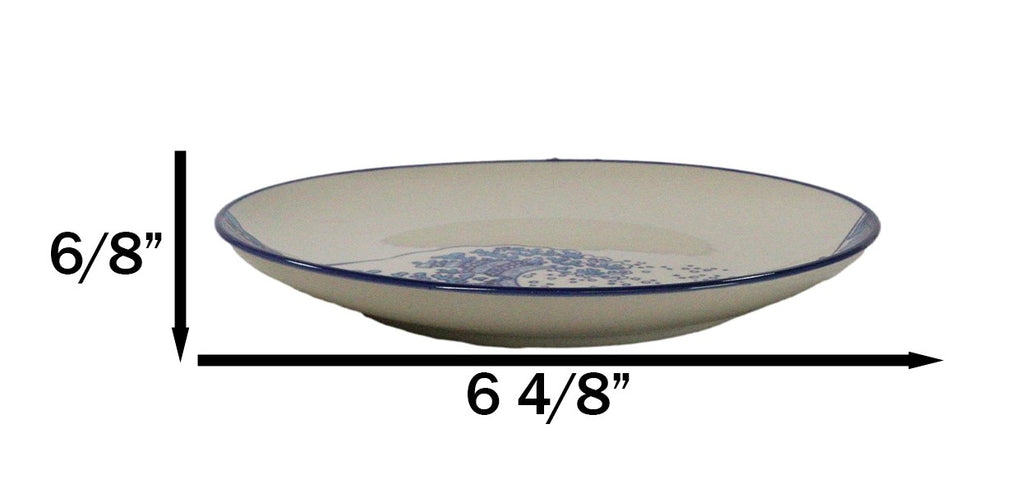 • These beautiful salad plates are made of ceramic porcelain. Our traditionally crafted pottery are made of the highest quality ceramic available and fired at a high temperature to maximize the strength of the ceramic, making them superior to other ceramics in the market. Our pottery are more resistant to cracks, stains, and scratches. Our ceramic is food safe and contain no lead or cadmium. • These Great Wave Plates each measures 0.75" High and 6.5" in Diameter approximately. Each plate weighs about 9 ounces. They are microwave and dishwasher safe. • The Great Wave off Kanagawa is one of the most iconic works of Japanese art, created by the famous ukiyo-e artist Katsushika Hokusai around 1831. Part of his series Thirty-Six Views of Mount Fuji, this woodblock print depicts a powerful, towering wave threatening to engulf three small boats, with Mount Fuji visible in the background. The wave's dynamic curves and the contrasting calm of Mount Fuji symbolize the sublime and uncontrollable forces of nature.